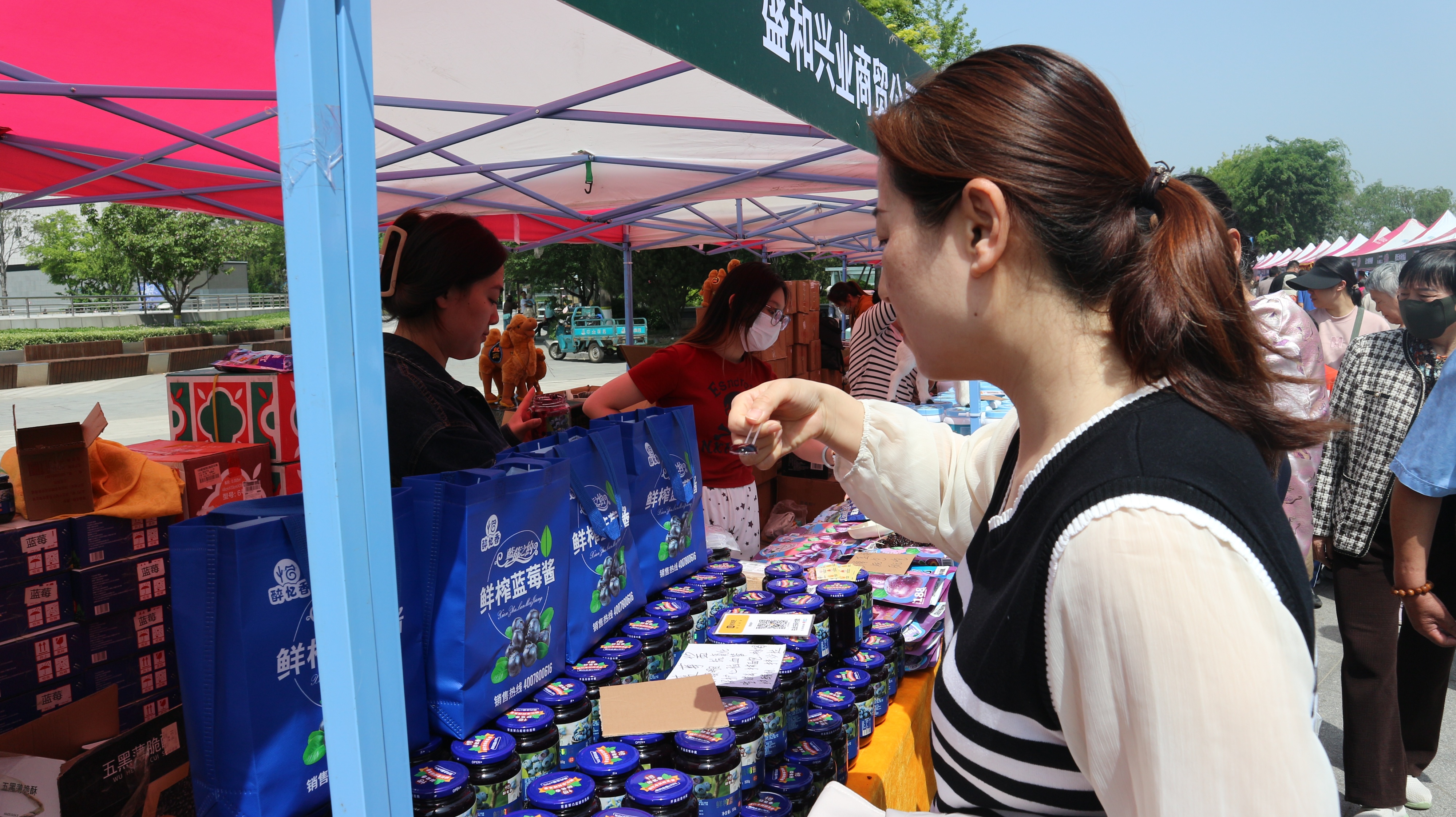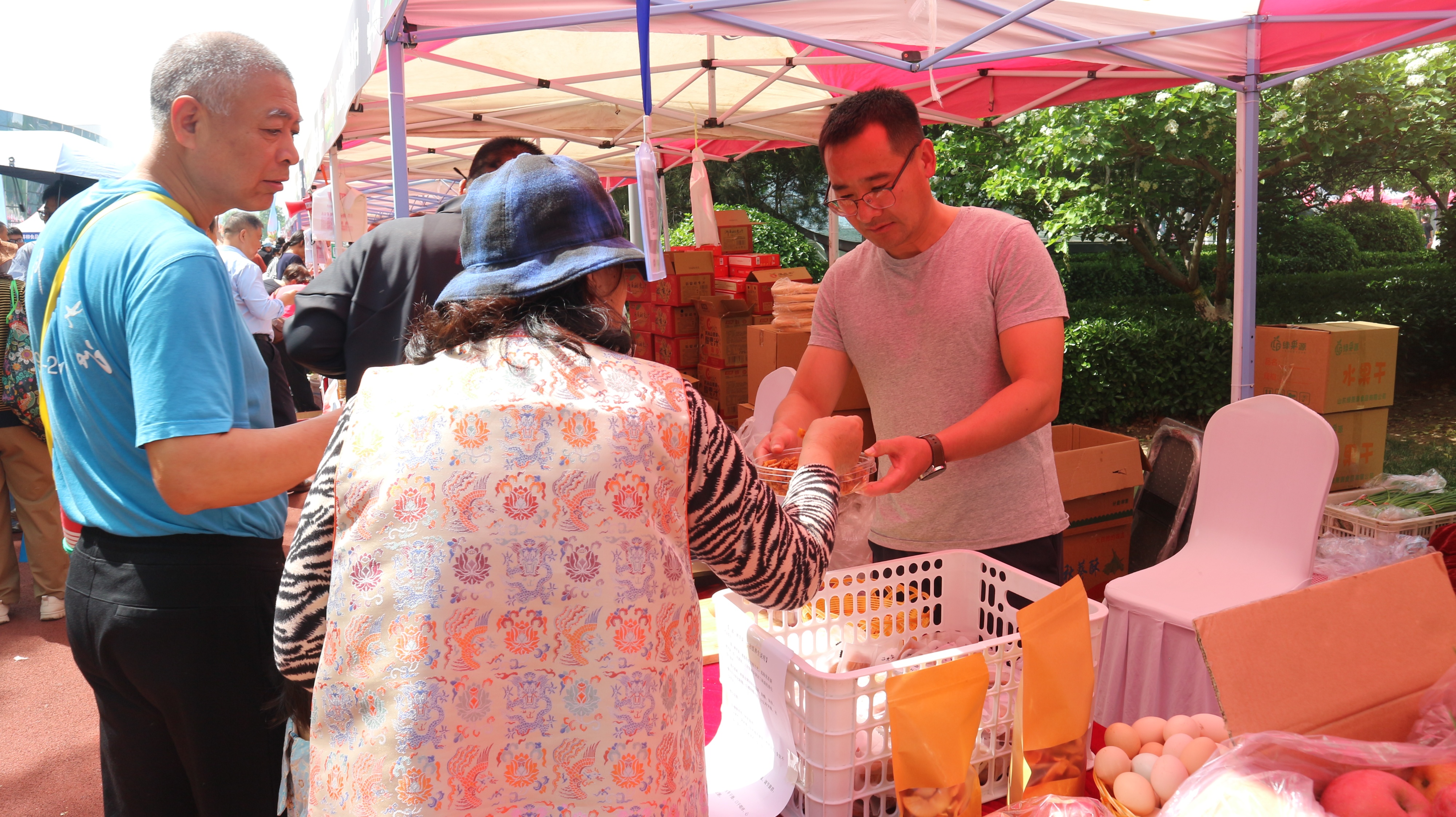 第一书记区同样人气爆棚,来自各驻村的第一书记化身“带货达人”,现场推介本土特色农品。“我们的中庄苹果口感脆甜,只要3.5元一斤,这款苹果干三蒸三晒零添加,健脾养胃,老人小孩都能吃,大家可以免费试吃!”沂源县中庄镇富家村第一书记李德全热情地向市民推介,试吃台前围满了闻讯而来的群众,不少市民品尝后当场下单。
