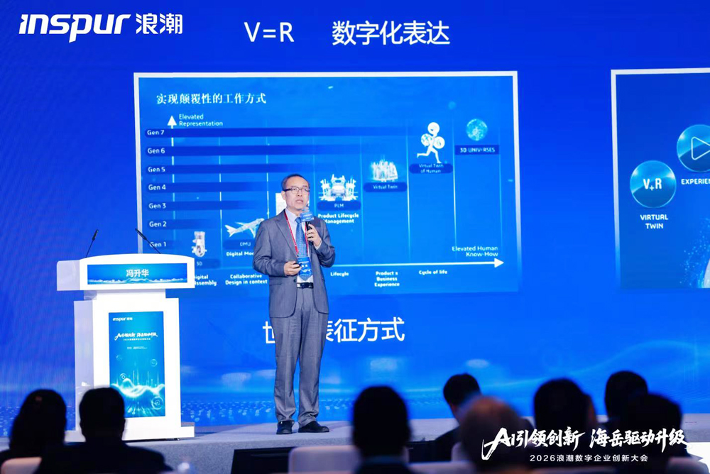 正是在这一背景下,浪潮数字企业与达索系统联合打造的浪潮海岳iBD在本次大会上应运亮相。达索系统大中华区技术总监冯升华受邀在大会主论坛发表主题演讲,从工业AI的演进逻辑为这套方案作出战略注脚。他指出,达索系统历经七代演进,构建了从“数字化表达”到“数字化赋能”再到“数字化蝶变”的完整工业AI技术路径。虚拟孪生让一切皆可连接、一切皆可虚实融合。它不仅是现实世界的镜像,更是知识生成和技术提升的核心引擎。同时,他强调,通过虚拟孪生技术,企业可以在虚拟环境中完成产品设计、工艺仿真、生产优化乃至运维预测的全流程闭环,从而加速从“经验试错”迈向“数字择优”。这一技术理念,正是浪潮海岳iBD得以实现端到端一体化的底层逻辑。
