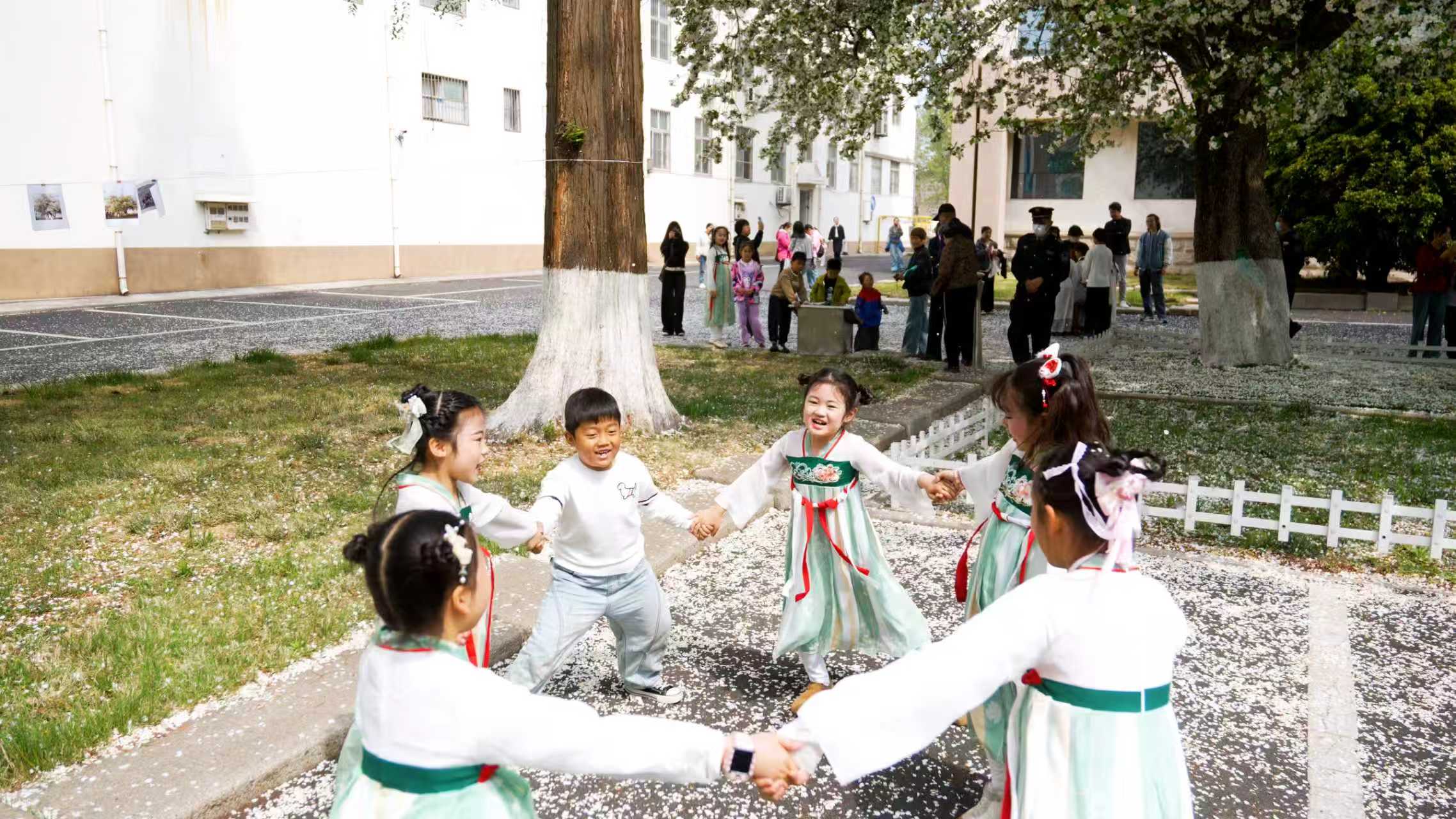 4月18日,日照市东港区政府大院内的两株古海棠树下,一群身着古风裙衫的孩童围坐成圈,小手拉小手,嬉闹着玩起游戏。稚嫩的童声伴着花瓣轻落,引得一旁驻足的外国友人会心一笑,举起手机定格这满庭芬芳与童趣交融的瞬间。