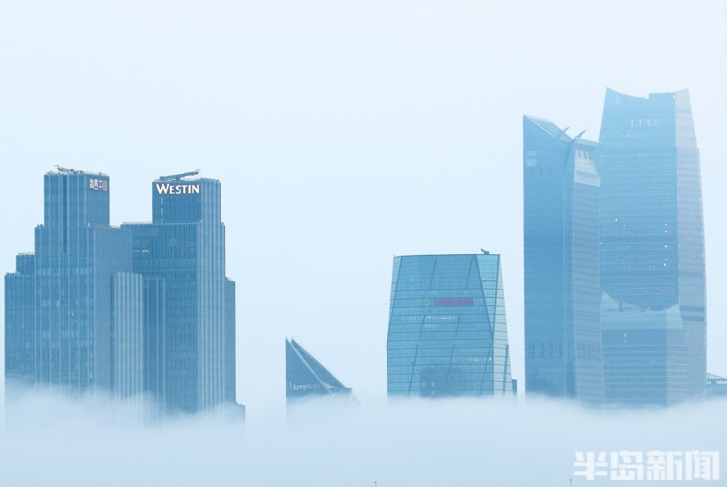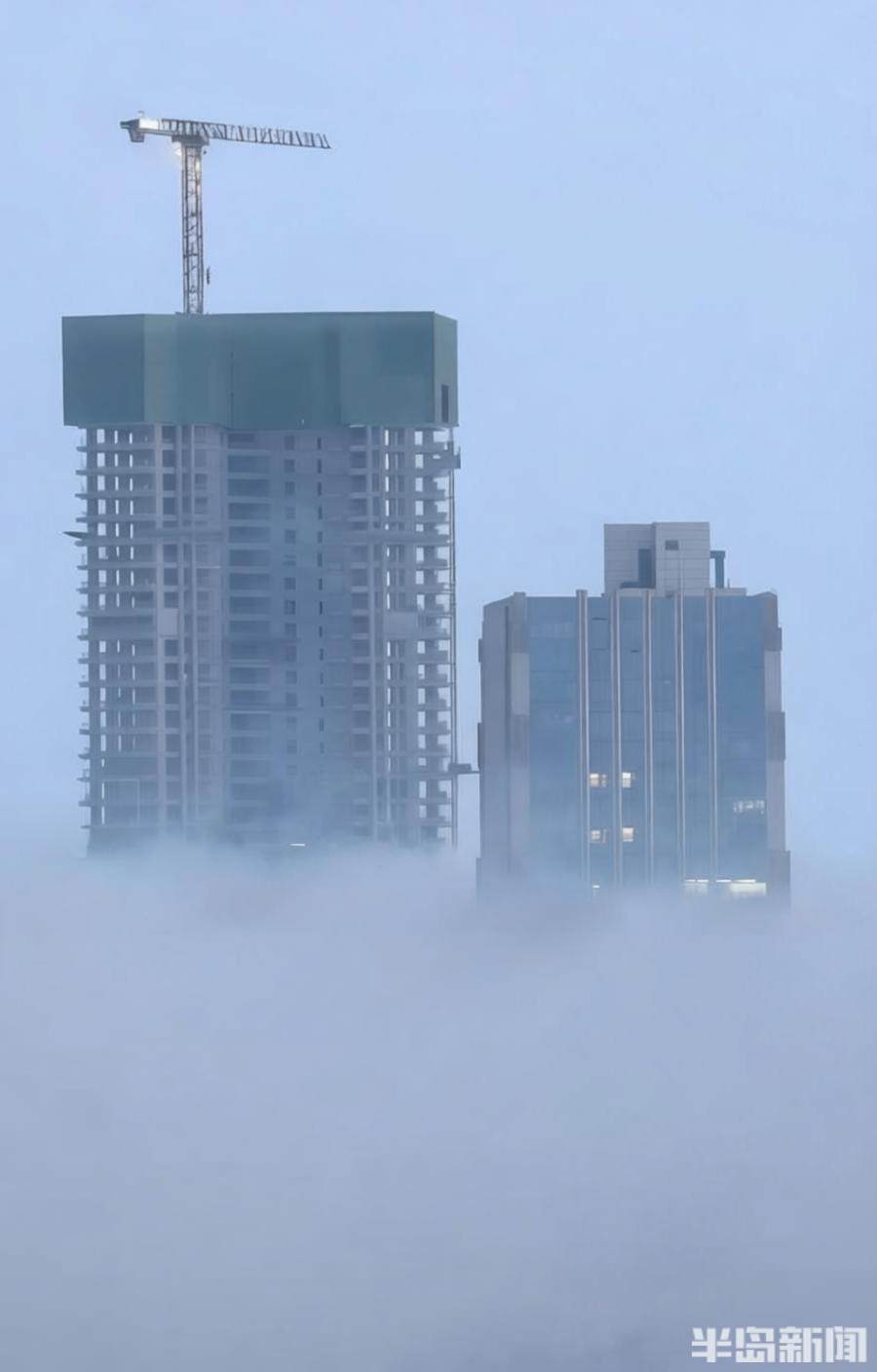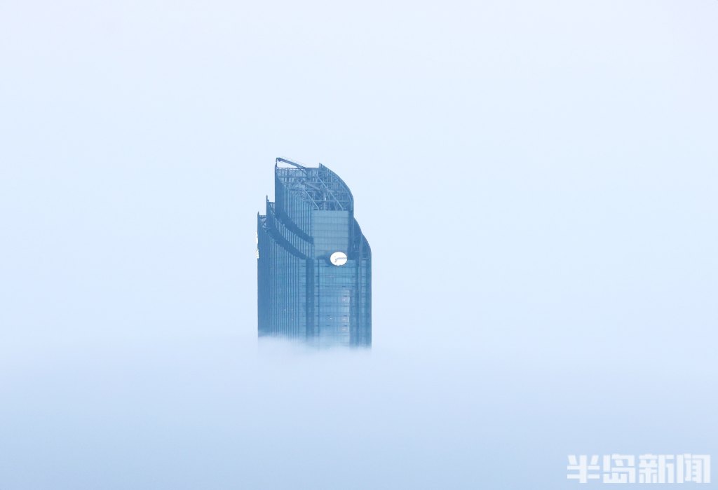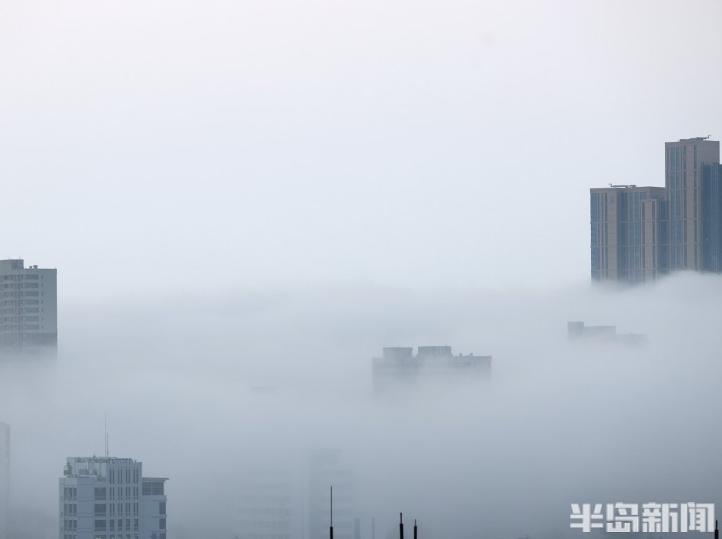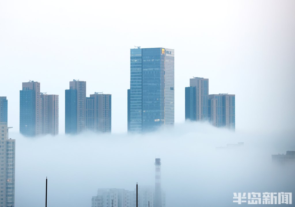 4月18日傍晚,岛城前海一线出现了平流雾,浓浓的雾气从海上涌入市区,大量雾气穿过前海的高楼,雾气之上只露出了楼顶,场面十分壮观。每年的春季开始,岛城又开始迎来了平流雾高发季节,也是岛城特有的一道风景线。(半岛全媒体记者王滨)