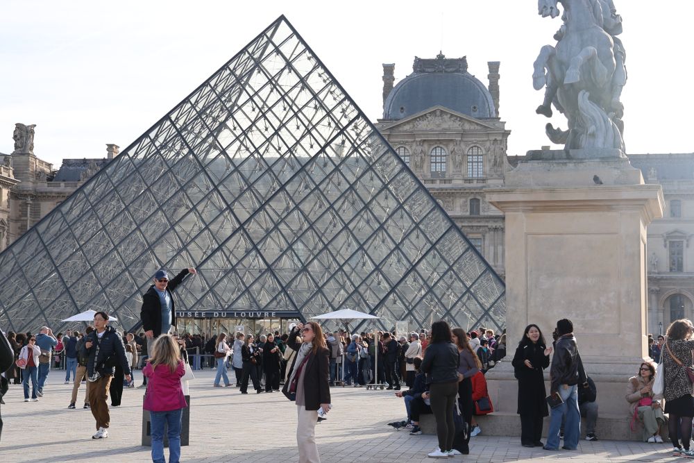2025年10月22日,在法国巴黎,大量游客聚集在卢浮宫博物馆的玻璃金字塔入口前。新华社记者 张百慧 摄