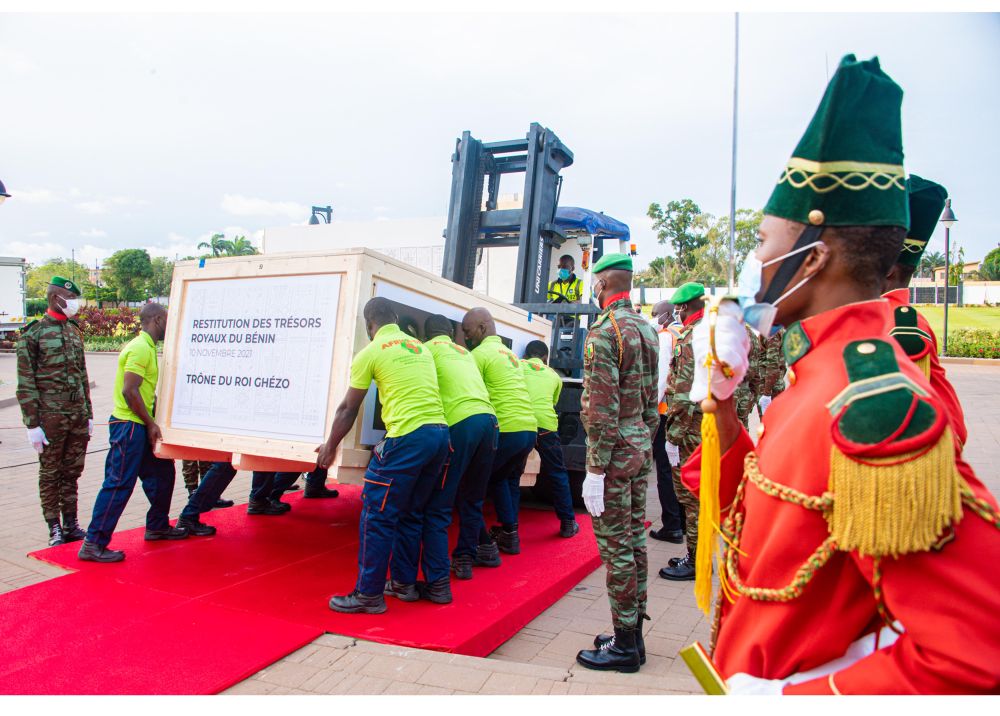 这张拍摄于2021年11月10日的资料照片显示,工作人员在贝宁科托努机场卸载历史文物。载有26件珍贵历史文物的飞机当日抵达贝宁,数百名当地居民庆祝这批国宝回到祖国。新华社发(贝宁总统府供图)