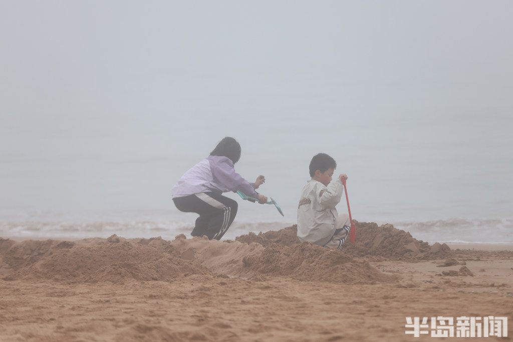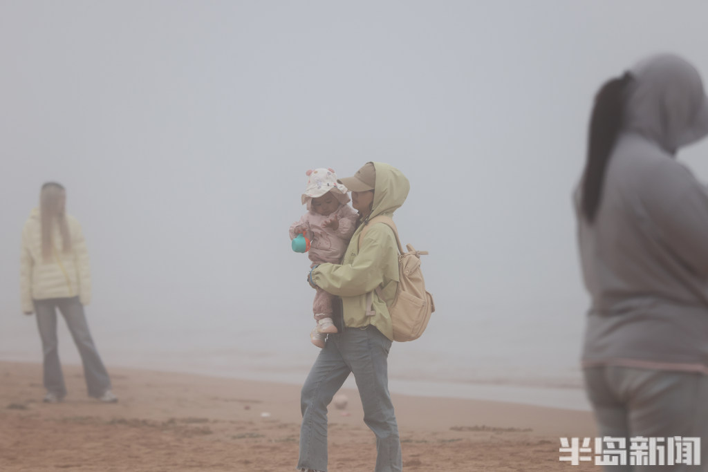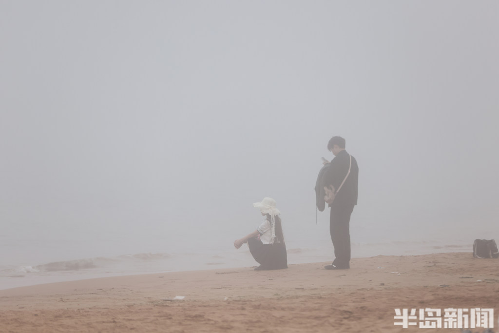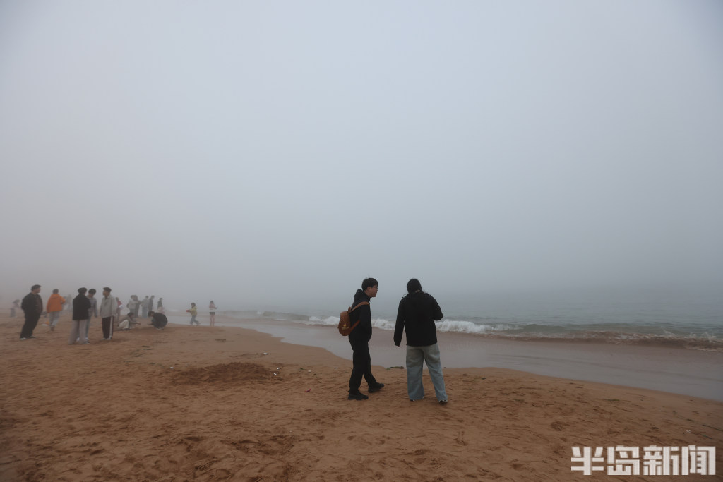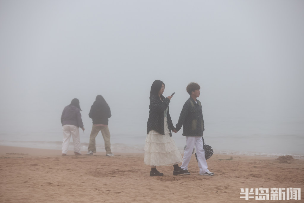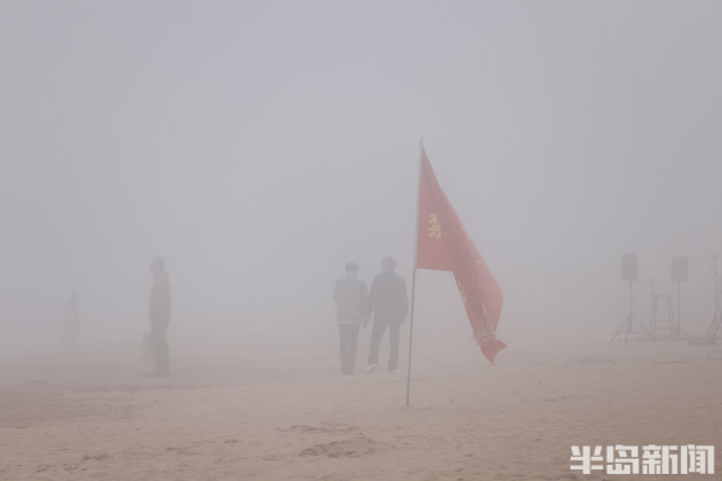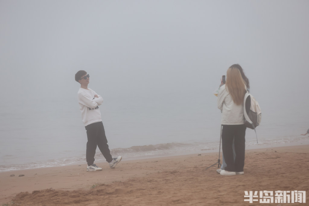 游人在雾中打卡海滨浴场