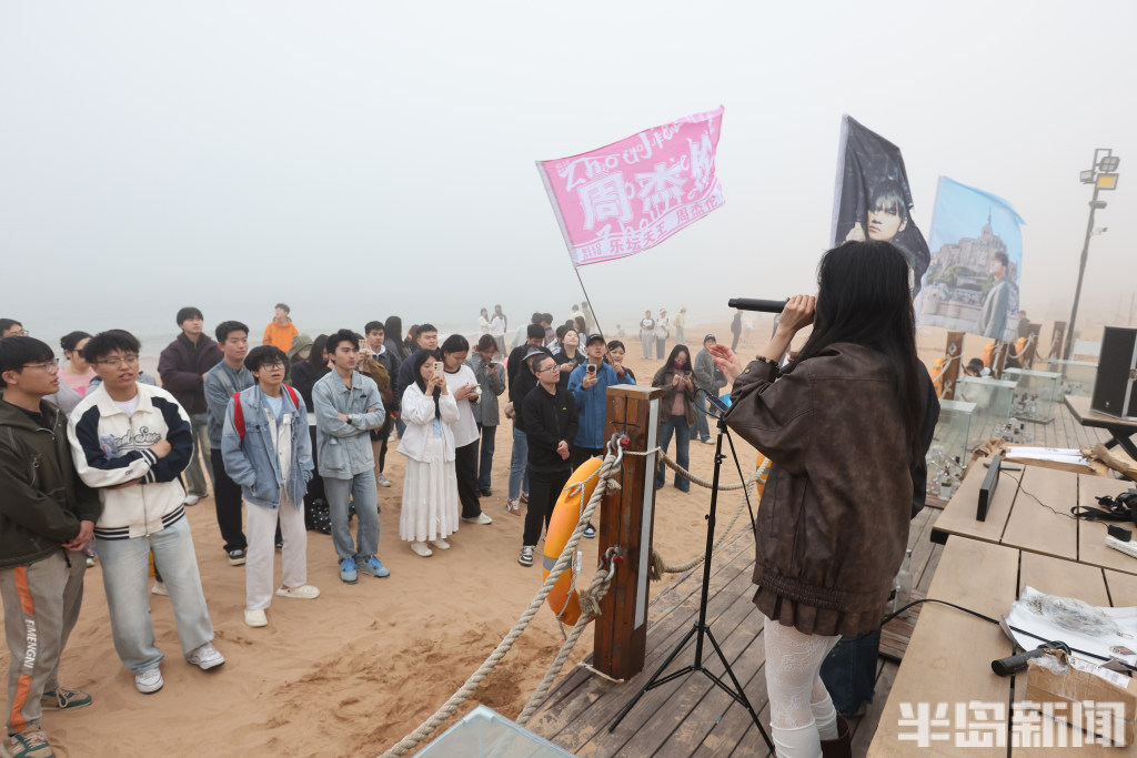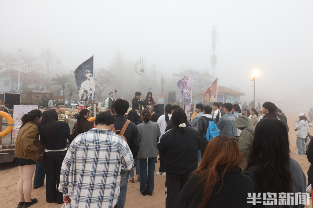 4月18日下午,青岛第三海水浴场,一些游客在这里休闲游玩。当日岛城市区海滨迎来阵阵平流雾,受大雾影响,浮山湾畔的高楼大厦一时间都从人们的视线中“消失”了。尽管如此,海滨依然释放着春日的活力,一些年轻人在此进行音乐演唱活动,吸引了不少游客驻足欣赏,感受海滨别样魅力。