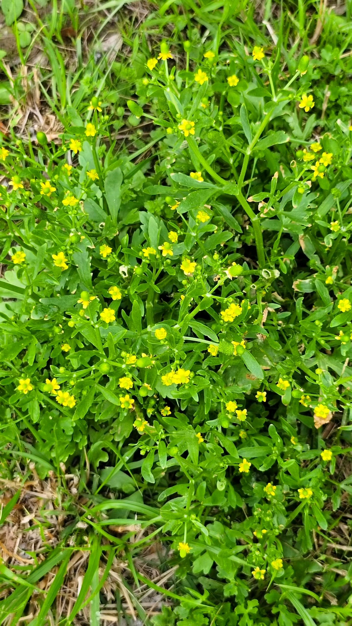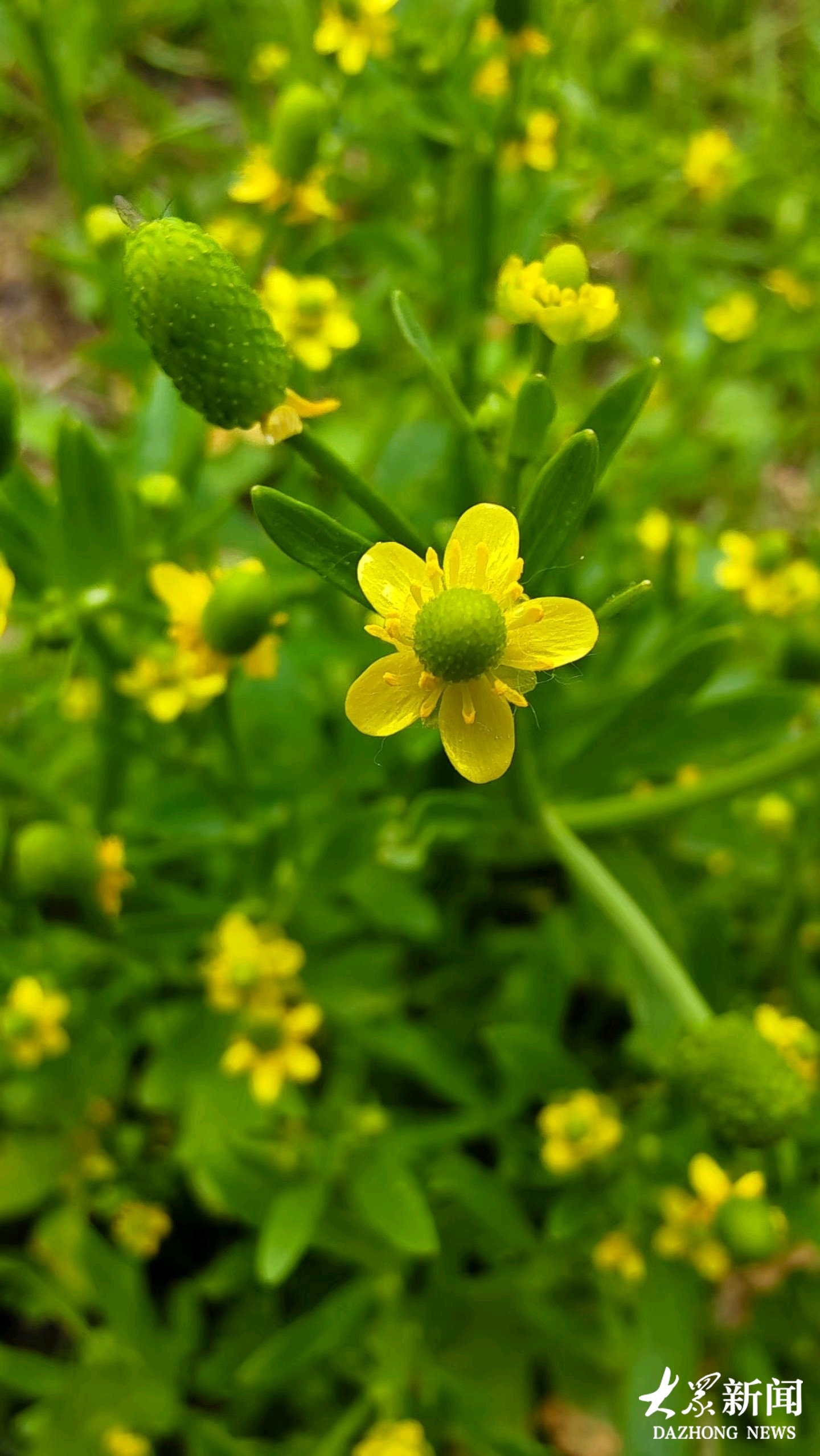 周末在行道树下发现一丛小花,黄花绿果看上去颇为妖冶。搜了一下,原来这小花的名字叫石龙芮,别名水堇、姜苔等。