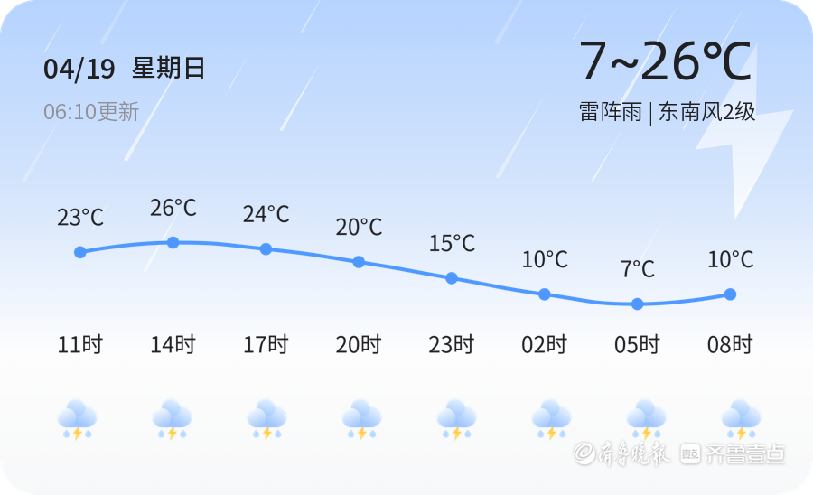 今天是4月19日,星期日,农历三月初三。德州迎来雷阵雨天气,气温波动较大,预计今日最高气温26℃,最低气温7℃。当前温度14.5℃,东南风2级,空气湿度86%,空气质量良好(PM2.5指数84)。市民朋友们请注意防雨防雷,出行时携带雨具,同时注意交通安全。早晨和夜间温差较大,建议适时增减衣物以适应气温变化。