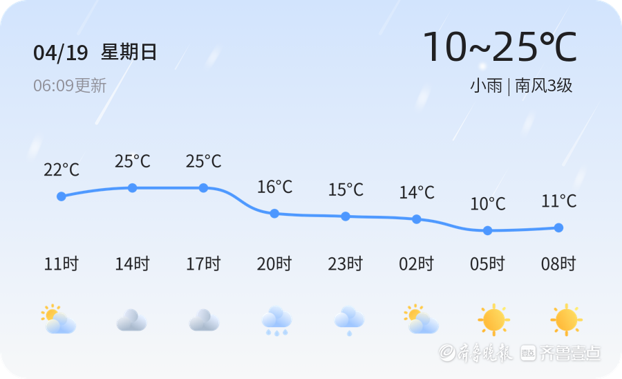 今天是4月19日,星期日,农历三月初三。聊城地区迎来小雨天气,气温介于10℃至25℃之间,南风3级,空气湿度为88%。PM2.5浓度为105,属于中度污染,建议敏感人群减少外出,注意防护。市民出行时请注意携带雨具,雨天路滑,驾车请减速慢行,确保行车安全。