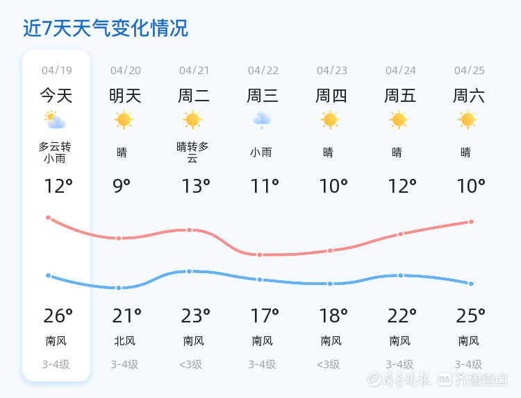 今天是4月19日,星期日,农历三月初三。泰安市今日天气多云转小雨,气温适中,最高气温26℃,最低气温12℃。目前气温为15.9℃,空气质量指数为126,属于轻度污染,市民外出时建议佩戴口罩。风力较弱,西风1级,空气湿度较高,达84%。各区天气情况基本一致,多云转小雨,局部地区可能有短时降雨。市民需携带雨具,以防降雨带来的不便。
