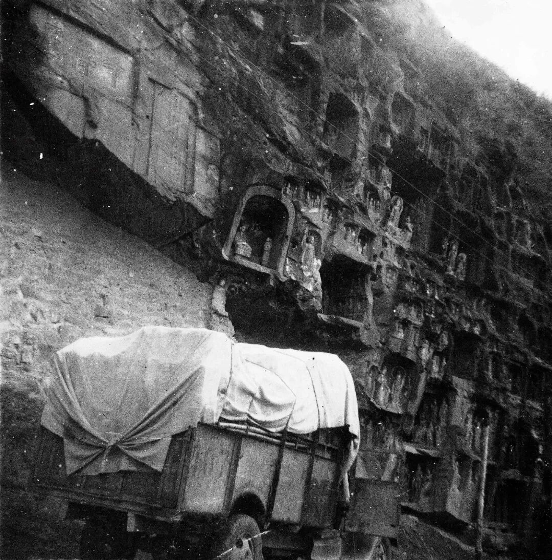 1938年,装载文物的军车驶过四川广元城外川陕路旁的千佛崖。