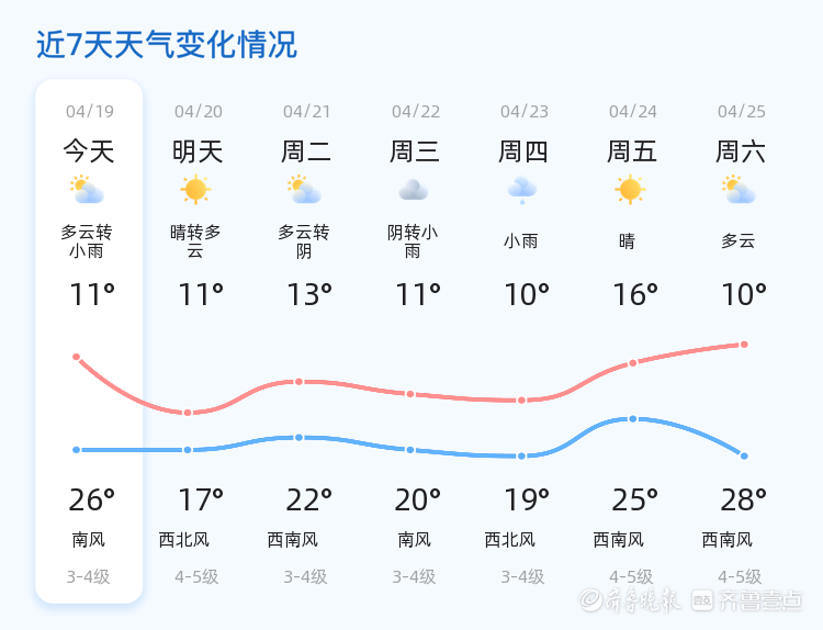 今天是4月19日,农历三月初三,烟台市迎来多云转小雨的天气。目前温度为14.6℃,西南风4级,空气湿度58%,PM2.5指数为41,空气质量良好。各区普遍出现多云转小雨的天气状况,市民出行请注意携带雨具,注意交通安全。
