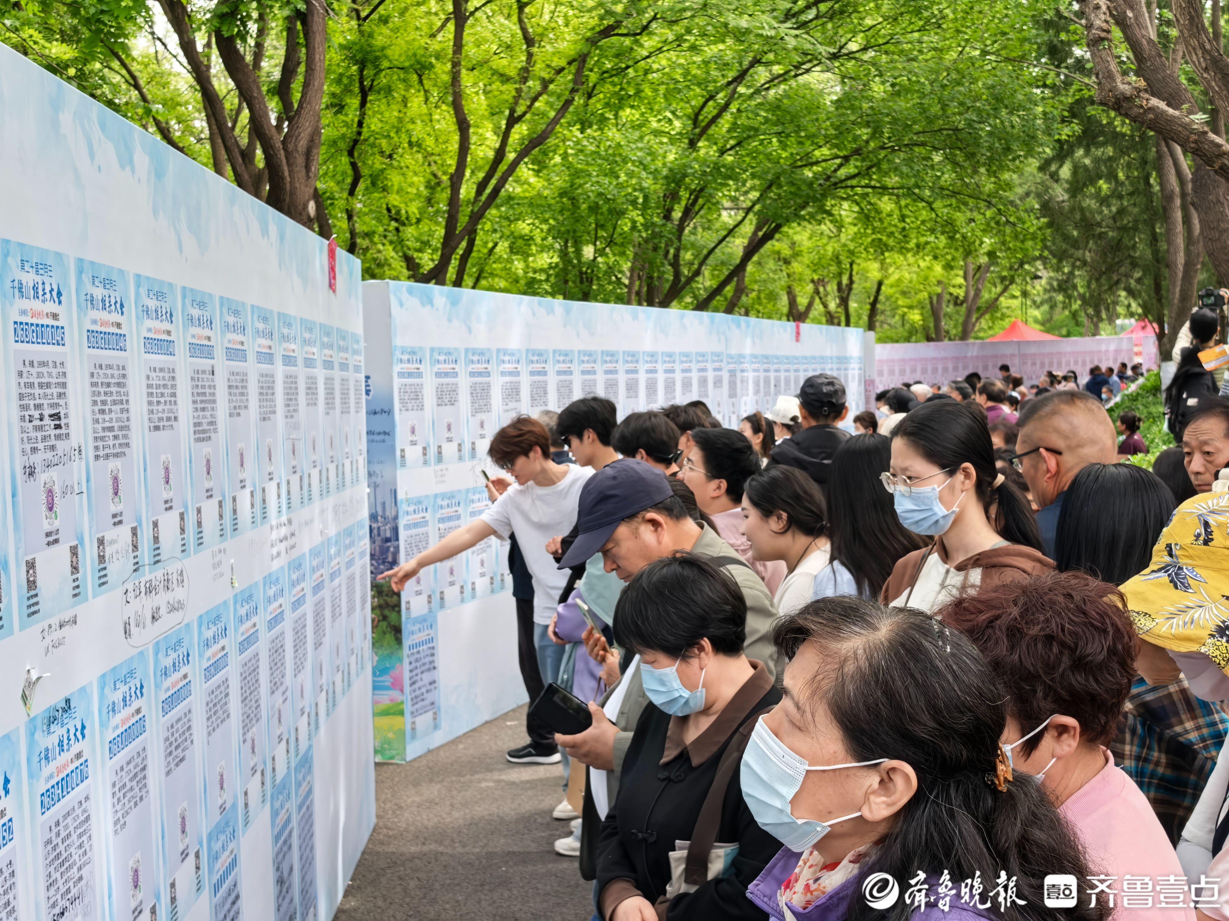 上午9点半,千佛山景区东门内广场已是人头攒动。数千份嘉宾信息牌整齐地排列着,在阳光映照下格外醒目。前来相亲的俊男靓女或驻足观看信息牌,或用手机扫码查看嘉宾个人主页,或三五成群交流攀谈,现场气氛热烈而有序。