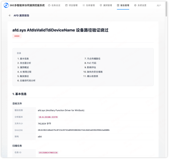 图为:360漏洞挖掘智能体自动化生成Windows内核提权漏洞(CVE-2026-24293)报告