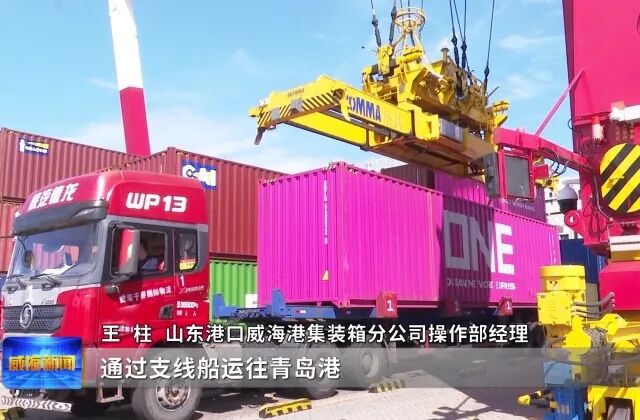 王柱说,往咱们威海来的(货物)大都是一些橡胶、轮胎的原材料,他们出口的货物就比较多了。通过支线船运往青岛港,(再)通过青岛港的母船发往世界各地,通过天天班的这种运营方式,实现了“两地一港”的发展战略。