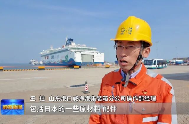 山东港口威海港集装箱分公司操作部经理王柱:我们身后的这条船就是“新永安”轮,“新永安”轮它是客货两用的船舶,进口(货物)大多是来自于韩国,包括日本的一些原材料、配件,出口大多是威海工厂(生产)的原材料。义乌,包括广东的小商品、电子产品等等,也是借势威海对韩的最优的“黄金通道”,从咱们(威海)这里运往韩国以及其他的地区。