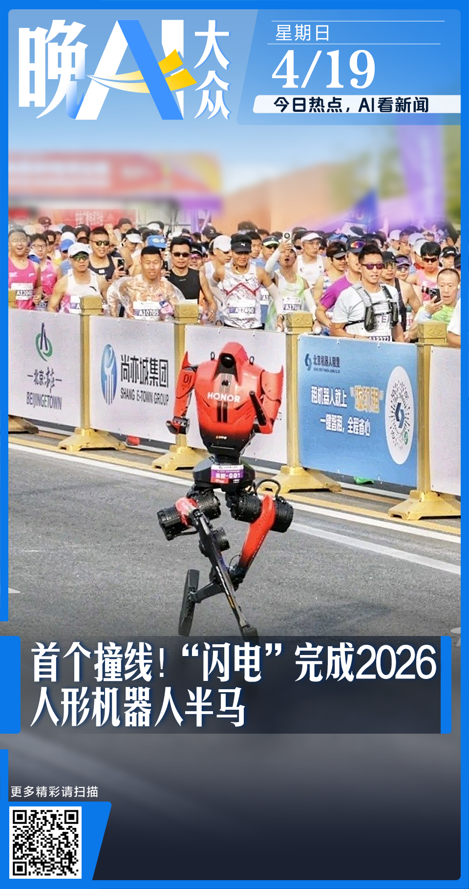 4月19日,2026人形机器人半程马拉松赛迎来历史性时刻——来自北京荣耀机器人战队的“闪电”,首个完成21.0975公里赛程,冲过终点线,成为本届半马的首位撞线的“钢铁跑者”。详情>>