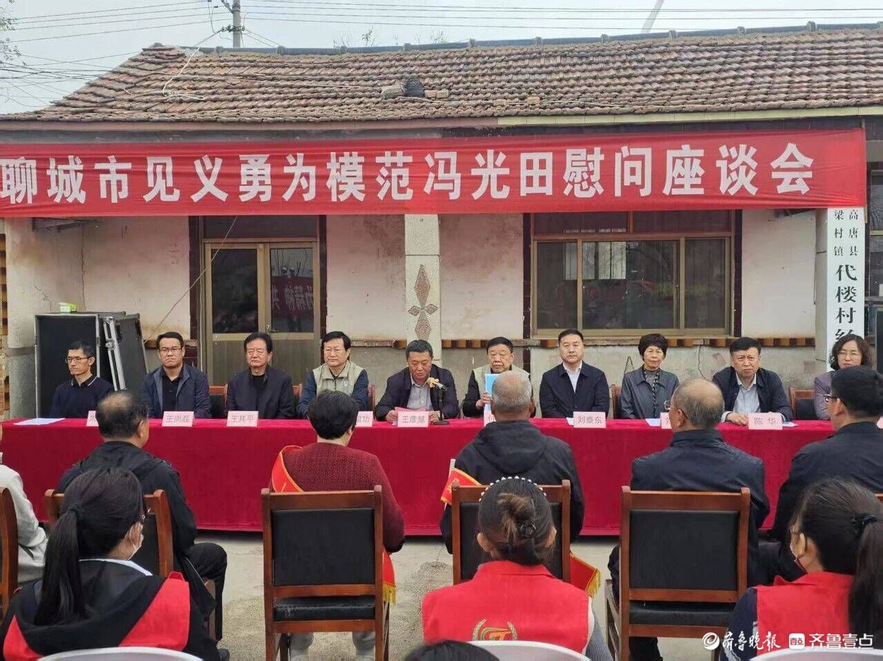 仪式上,刘泰东介绍了冯光田见义勇为的先进事迹,对其临危不惧、挺身而出的英勇行为给予高度评价和充分肯定。孙留功宣读了聊城市见义勇为基金会《关于对冯光田开展即时表扬的决定》,并为其颁发了荣誉证书、奖励金和见义勇为人员免费体检卡。