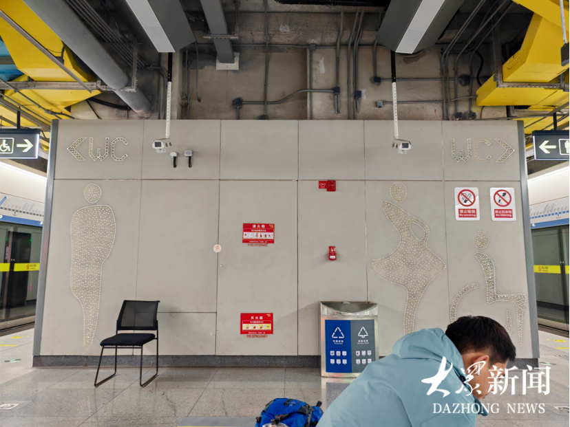 记者留意到,该地铁站公厕外墙仅标注“WC”字样指引方向,配套的两幅装饰性抽象图案中,单个人物轮廓图案对应男厕所,双人物抽象图案则指向女厕和无障碍厕所。