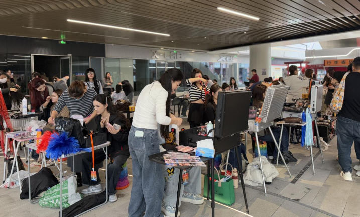 4月18日下午三点,距离演唱会开始还有4个小时,杭州奥体中心某场馆外的化妆摊已经一派忙碌景象。“多巴胺”彩色眼影、亮钻贴片、应援色编发……对不少粉丝来说,预约一个专属“应援妆”,已经成为看演唱会的标配。