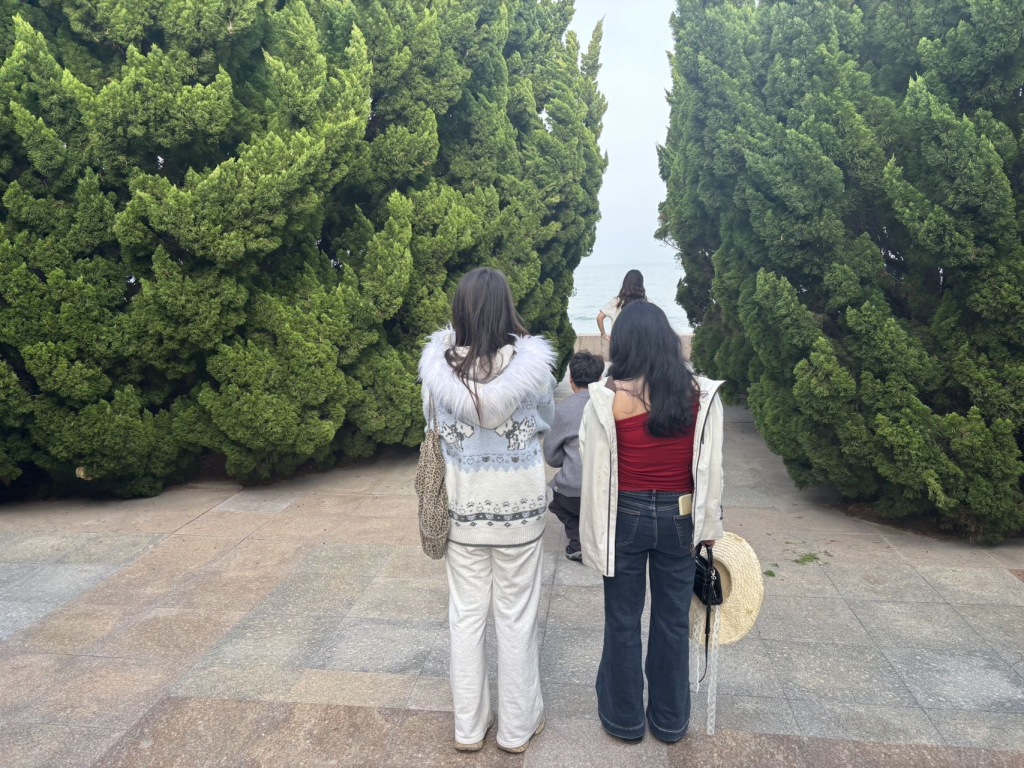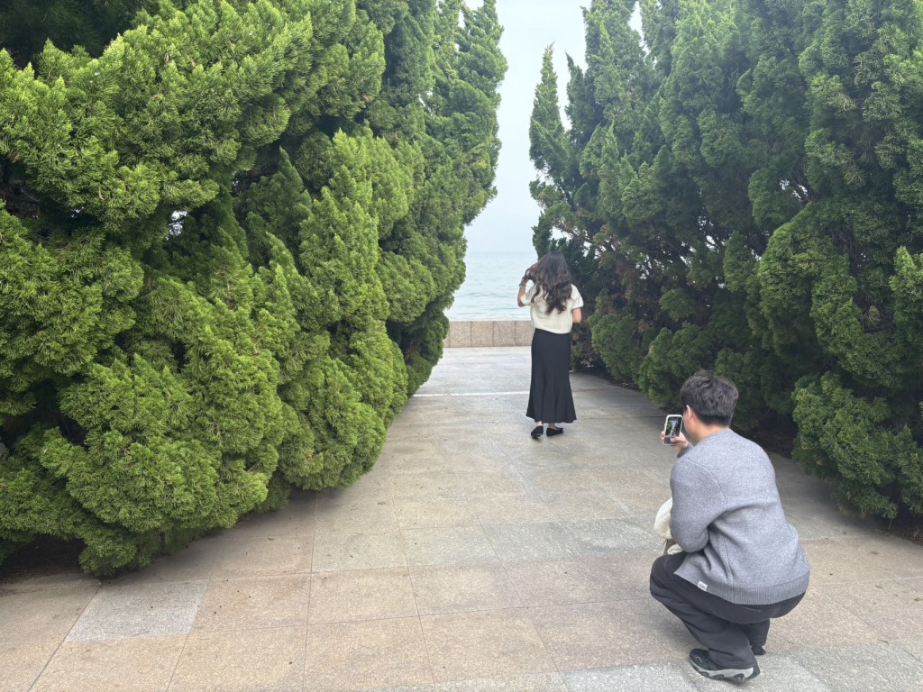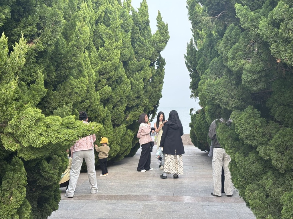 4月18日,青岛雕塑园东侧,松柏苍翠成林。不少年轻女孩穿梭林间排队打卡,纵深丛林映衬着碧海蓝天,一步一景,让游客沉醉其间、流连忘返。(半岛全媒体记者何毅)