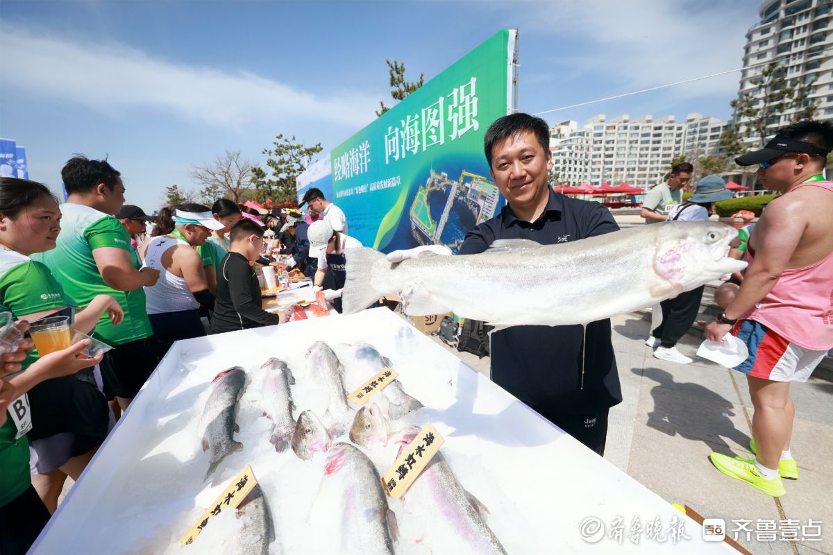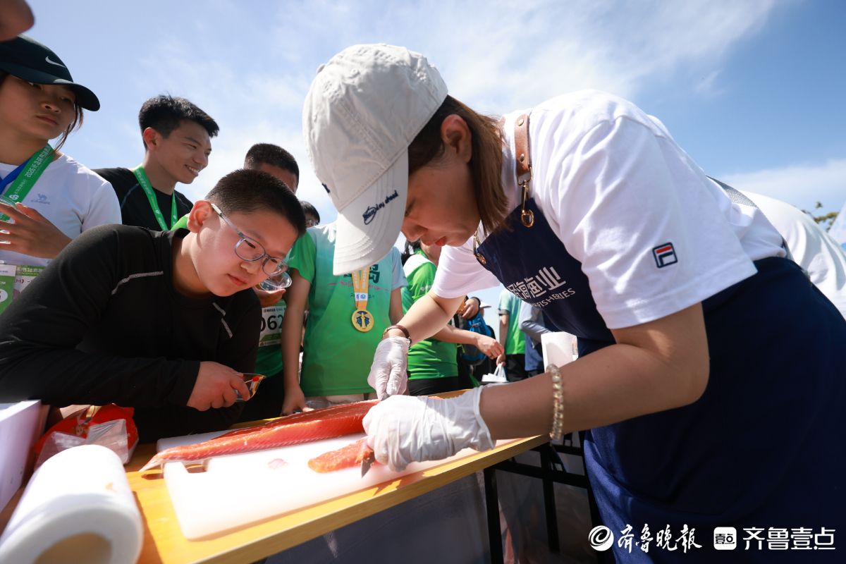 活动终点经海渔业展示新鲜的三文鱼,为跑者提供海鲜大餐。