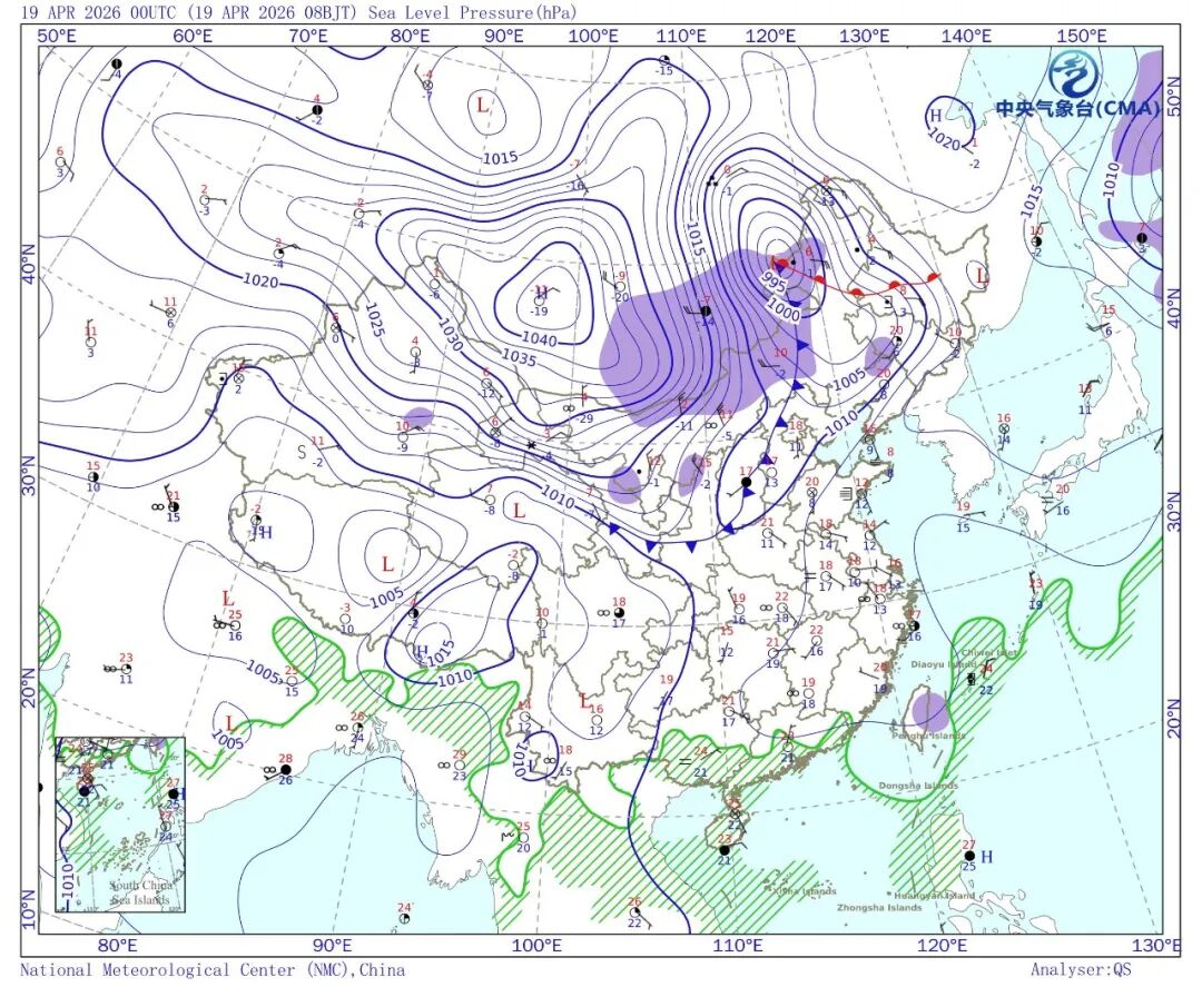 这一切主要是因为强冷空气和蒙古气旋的影响。今天白天冷高压中心强度达到1040百帕,这在4月算是很强的冷空气。