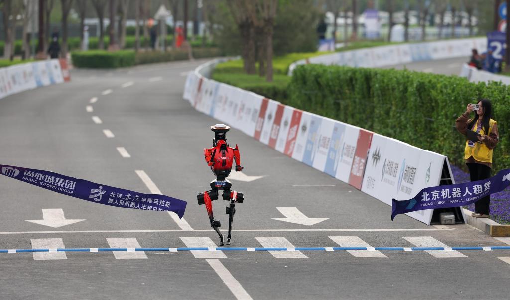 4月19日,2026北京亦庄半程马拉松暨人形机器人半程马拉松在北京亦庄举行。齐天大圣队自主人形机器人选手“闪电”在比赛中冲线。新华社发