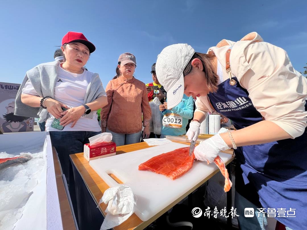 沿途村落的村民们热情满满,纷纷拿出自家特色海产,从肥美的海蛎子、鲜甜的扇贝,到暖心的海参汤、地道的渔家包子,每一份补给都承载着长岛人的淳朴心意。而长岛“蓝色粮仓”带来的三文鱼补给,更是成为全场最亮眼的“明星”——现场由专人现切、即时供应,色泽鲜亮的鱼肉纹理清晰,为奔跑中的选手补充能量。