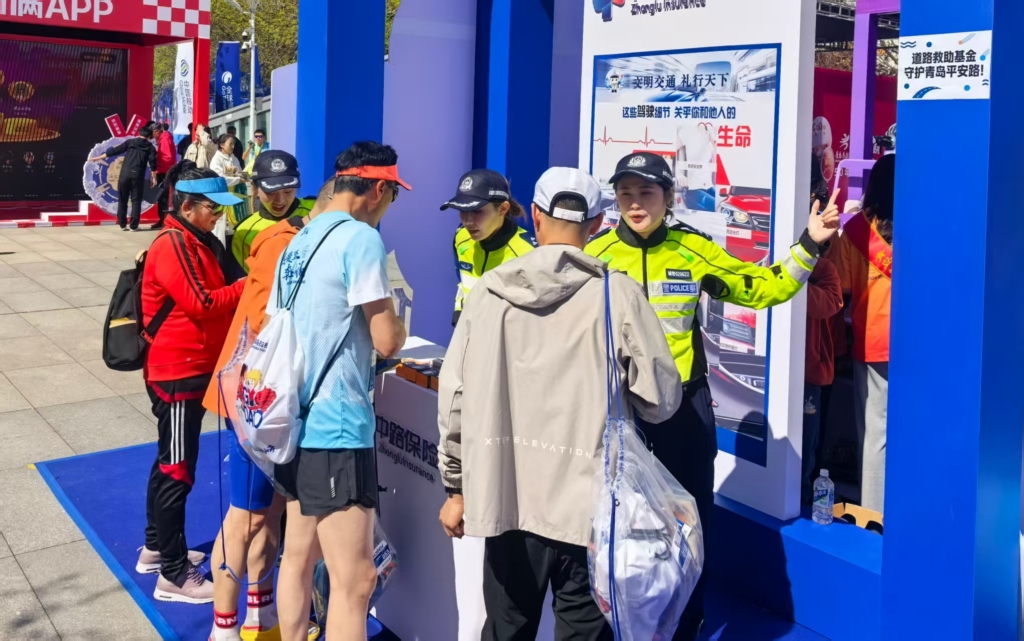 为了营造安全参赛文明出行的良好氛围,公安交管部门在马拉松赛事终点设立了交通安全宣传点,通过摆放宣传展板、发放安全手册等方式,向参赛选手和观众普及“一盔一带”、道路交通事故救助基金和道路交通事故视频快处等相关交通安全知识,增强文明出行意识,为赛事增添一份安全守护。