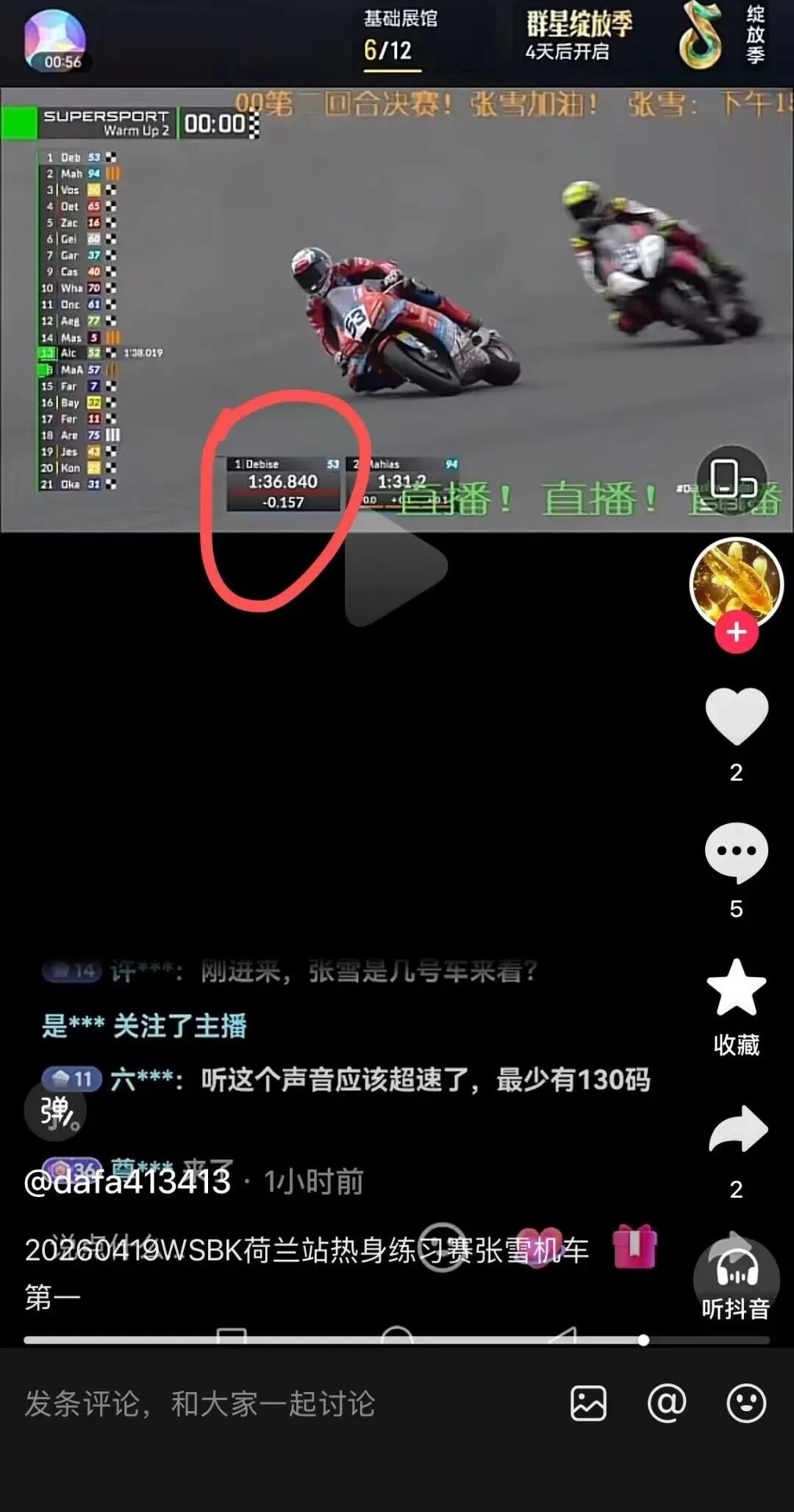 4月19日,张雪机车的53号车手瓦伦丁·德比斯在世界超级摩托车锦标赛(WSBK)2026赛季第三站荷兰站第二回合Warm-Up热身练习赛中取得第一名,成绩为1分36秒840。据了解,该热身赛不直接计入正赛积分,主要是为了让车手适应场地的赛道温度、天气等因素。