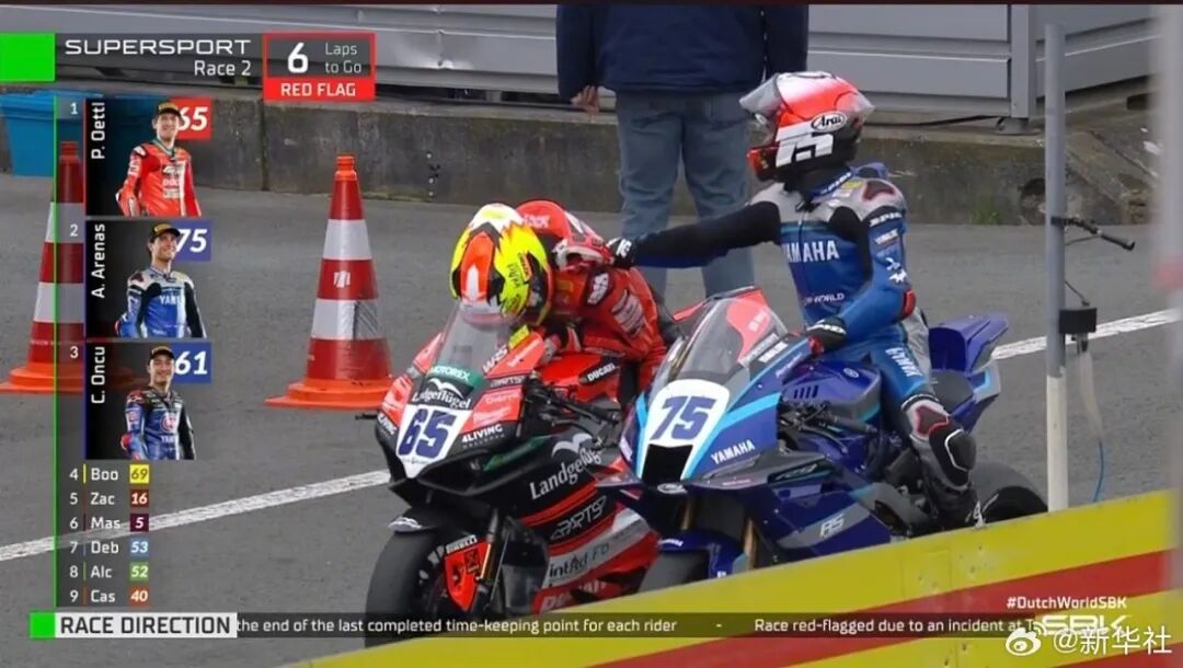 据@新华社消息,在刚刚结束的2026世界超级摩托车锦标赛(WSBK)荷兰站WorldSSP组别中,中国摩托车制造商张雪机车的法国车手瓦伦丁·德比斯在第二回合正赛中排名第7。另据@人民日报消息,WSBK荷兰站正赛第二回合遭遇雨战,在还剩6圈结束时,因有车手摔倒,赛会出示红旗,比赛提前结束。 此前报道张雪回应获第四名
