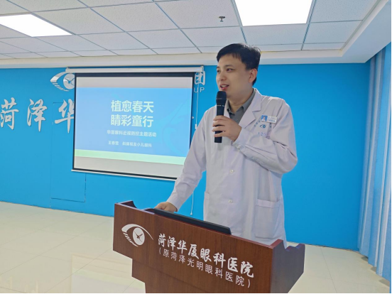 活动伊始,菏泽华厦眼科医院斜弱视及小儿眼科王春营主任带来近视防控科普讲座,用通俗易懂的语言,为现场家长和孩子们送上了一份实用的“护眼指南”。作为深耕小儿眼科领域十余年的资深专家,王春营主任是副主任医师、民盟盟员,同时担任山东省社会办医疗机构协会眼科管理分会委员,毕业于山东大学临床医学专业,先后在多家国内知名眼科机构深造,积累了极为丰富的临床经验。他熟练掌握常见眼科疾病的诊断治疗,擅长各种疑难斜视的诊断与治疗、弱视训练及屈光不正的配镜与近视防控,为无数家庭守护了孩子的清晰视界,是菏泽家长们信赖的“儿童护眼专家”。