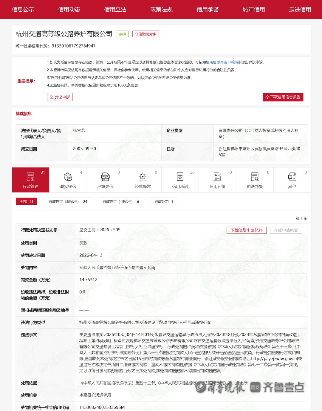 4月13日,信用中国公示了对杭州交通高等级公路养护有限公司的行政处罚决定。
