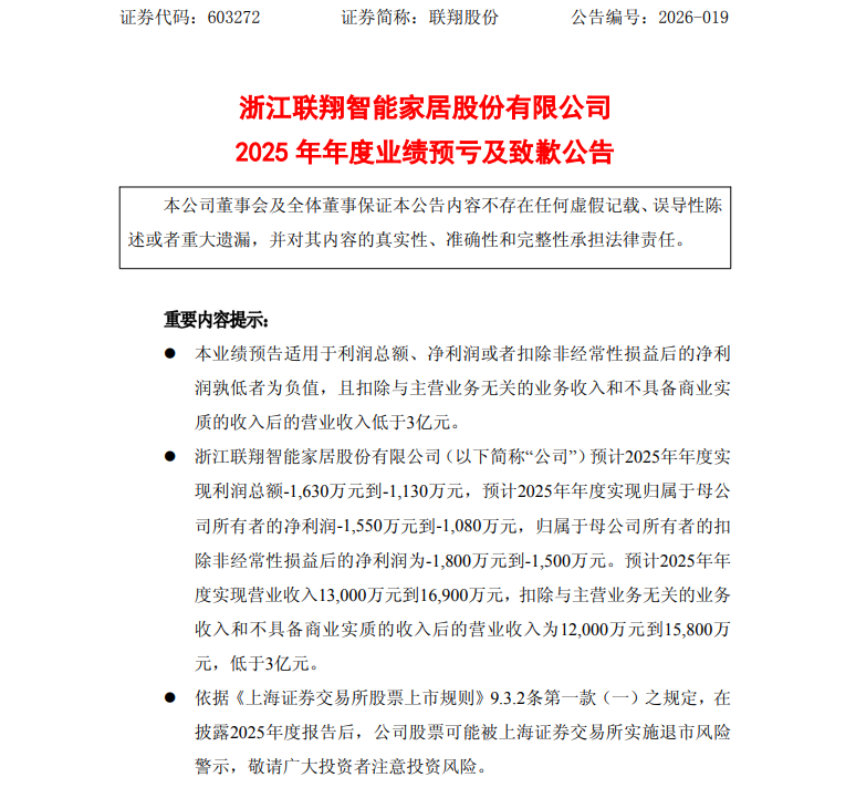 公告显示,联翔股份预计2025年年度实现利润总额-1630万元到-1130万元,预计2025年年度实现归属于母公司所有者的净利润-1550万元到-1080万元,归属于母公司所有者的扣除非经常性损益后的净利润为-1800万元到-1500万元。预计2025年年度实现营业收入1.3亿元到1.69亿元,扣除与主营业务无关的业务收入和不具备商业实质的收入后的营业收入为1.2亿元到1.58亿元,低于3亿元。