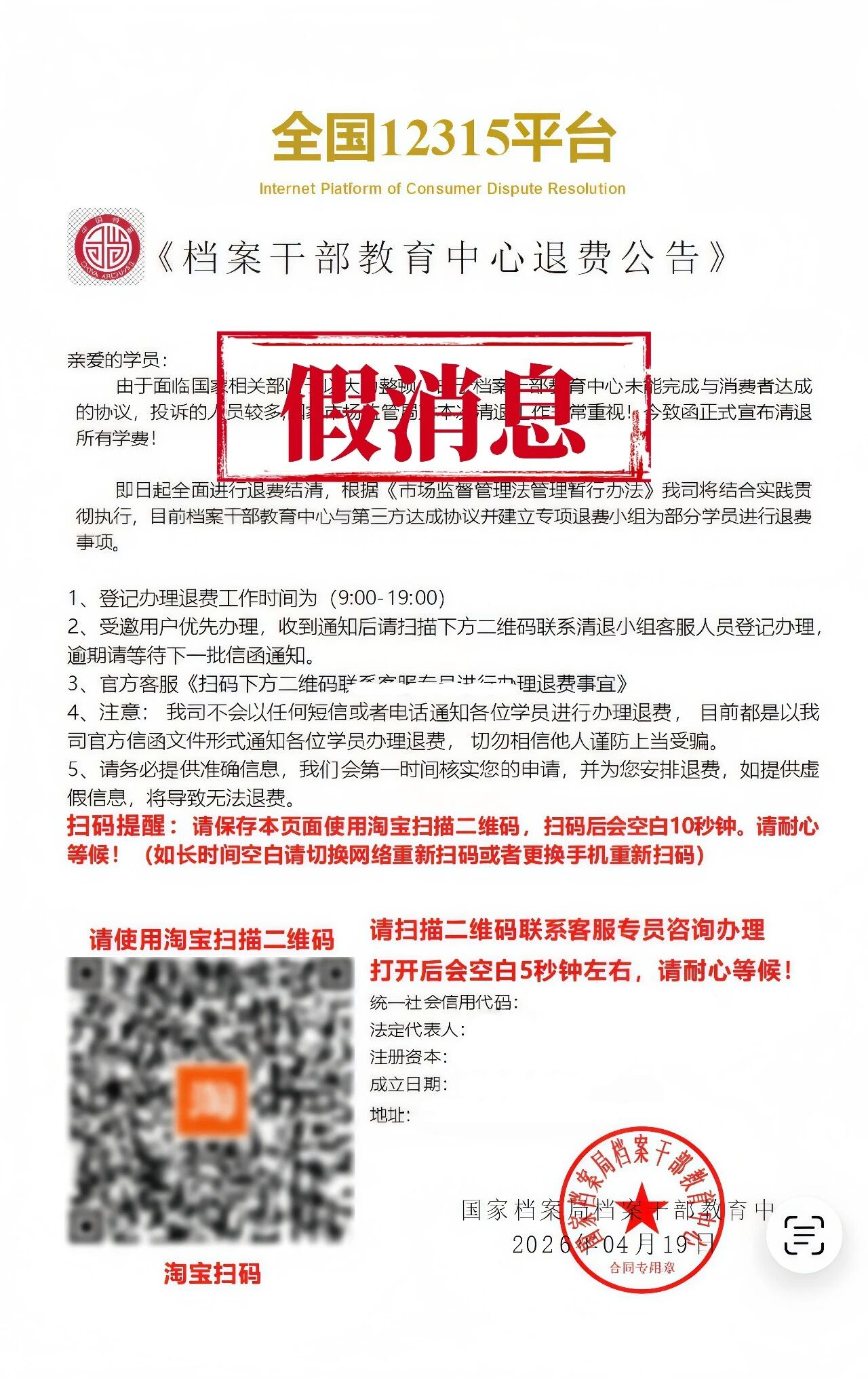 国家档案局档案干部教育中心指出,我单位从未发布任何形式的“退费公告”,亦未授权任何第三方机构或个人以我单位名义开展所谓的退费工作;我单位从未要求学员通过扫码方式办理退费,该公告中使用的公章样式系伪造,请广大学员不要轻信,切勿点击或扫码;若您已按照该公告提示进行扫码操作并遭受财产损失,请尽快保存相关证据(截图、聊天记录、转账凭证等),并向当地公安机关报案或拨打反电信网络诈骗专用号码96110;对于任何冒用我单位名义发布虚假信息、侵害公众权益的行为,我单位将依法向有关部门举报,并保留追究相应法律责任的权利。