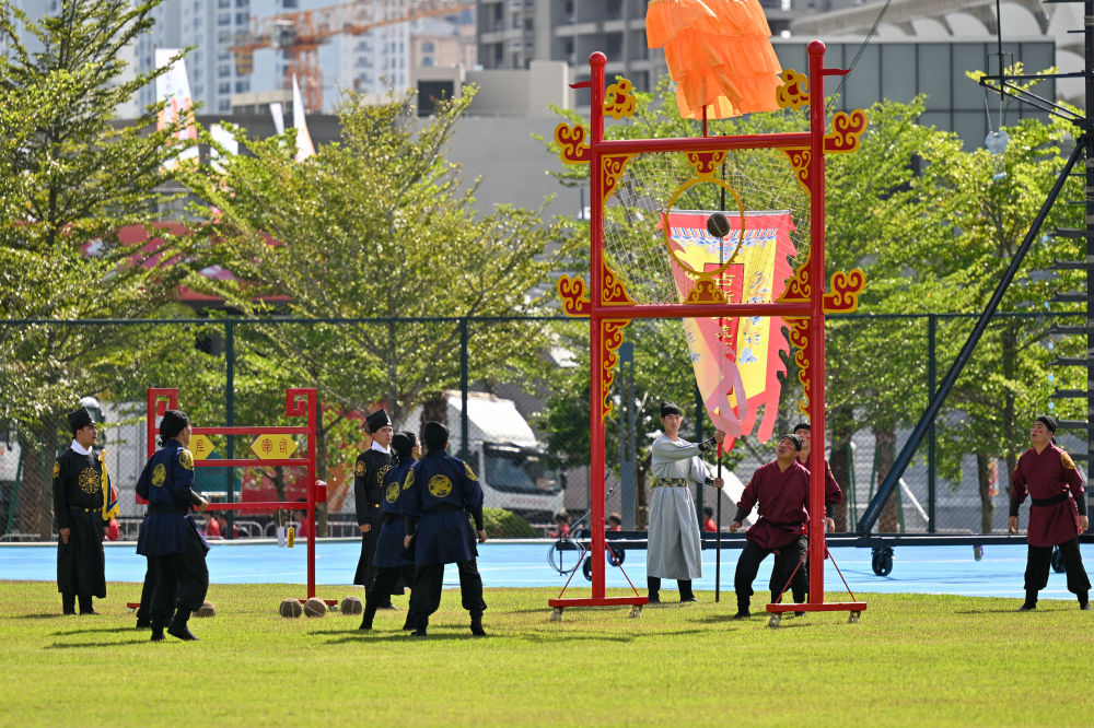 第十二届全国少数民族传统体育运动会期间,山东队选手表演《蹴鞠》。新华社记者 孙凡越 摄