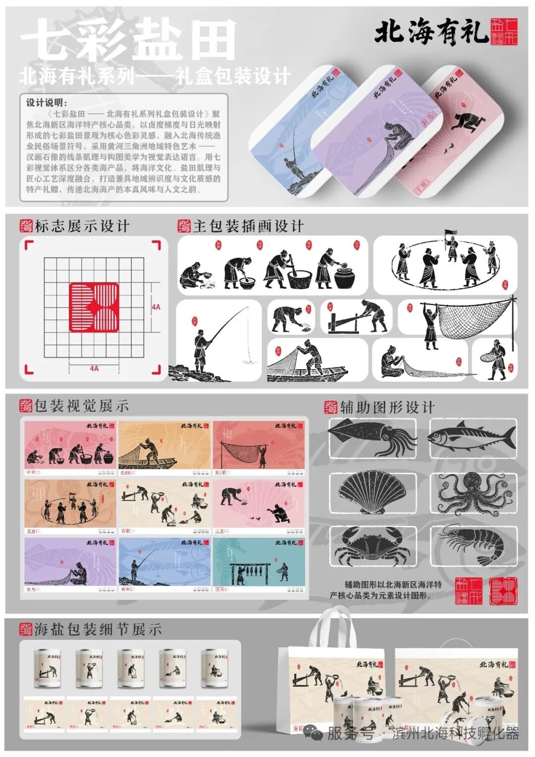 近日,2025“海韵河秀·品质滨州”文旅商品创意设计大赛获奖名单正式公示。滨州北海科技孵化器有限公司员工王越、吴鹏本凭借卓越的创意设计与深厚的文化底蕴,从全国千余件参赛作品中双双脱颖而出。其中,王越的作品《七彩盐田—北海有礼系列礼盒包装设计》荣获包装类三等奖,吴鹏本的作品《滨小海系列文创》荣获专项命题类优秀奖,为北海文旅创意再添荣誉。