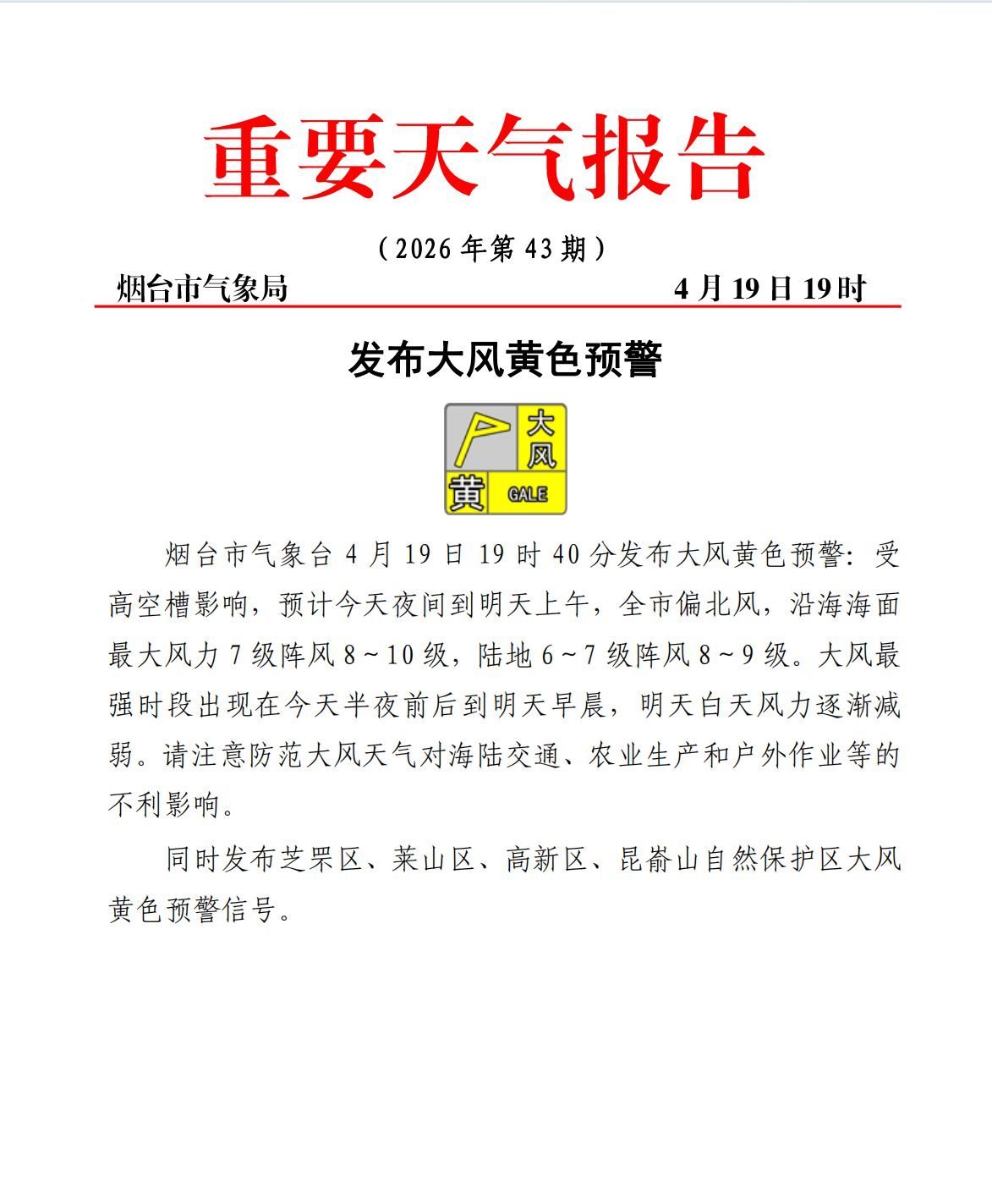同时发布芝罘区、莱山区、高新区、昆嵛山自然保护区大风黄色预警信号。