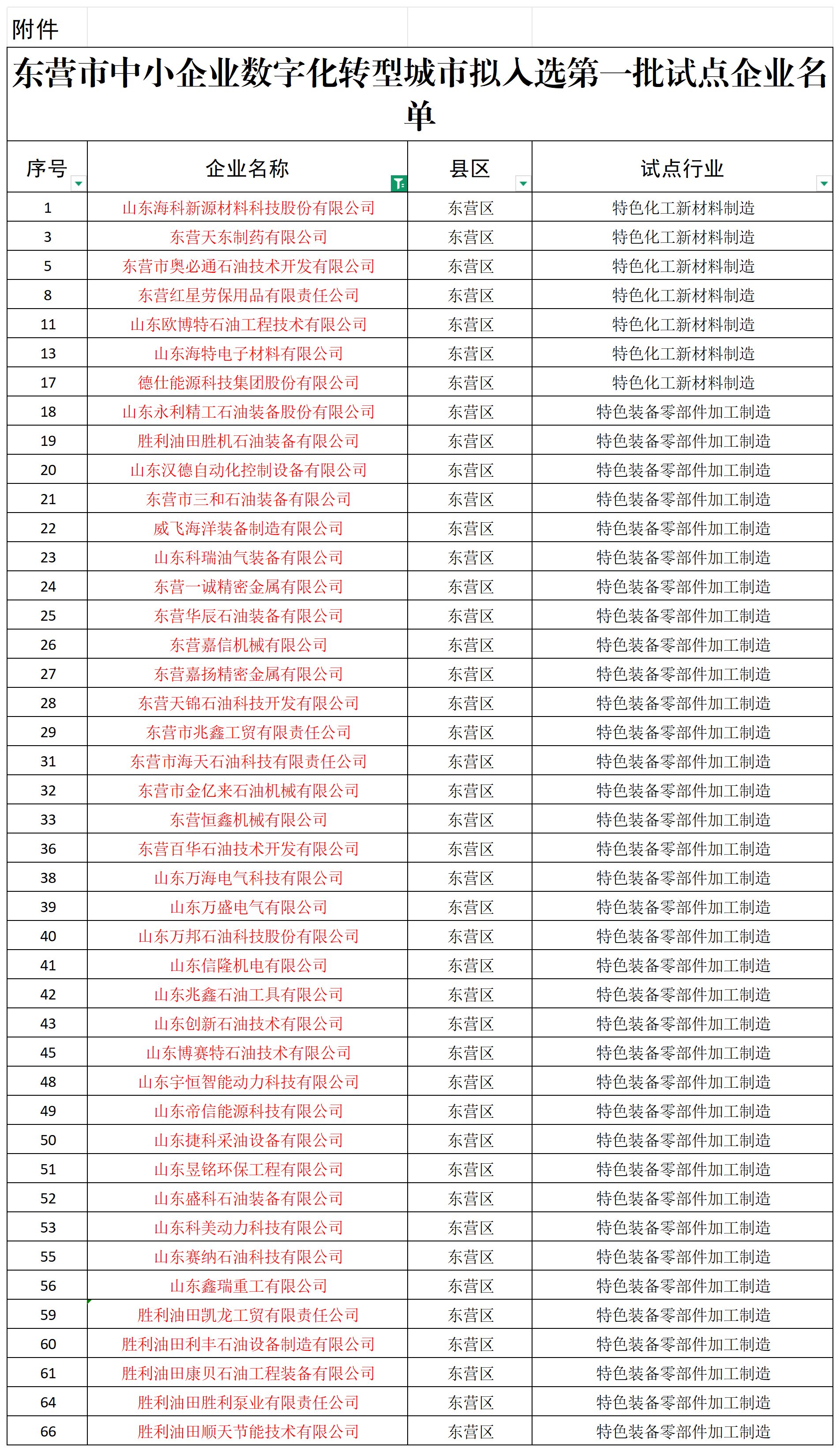 近日,东营市中小企业数字化转型城市拟入选第一批试点企业名单公示,东营高新区43家企业入选,覆盖特色化工新材料制造、特色装备零部件加工制造两大核心领域。入选企业既包括行业龙头骨干,也涵盖专精特新潜力企业,充分展现了园区中小企业数字化转型的坚实基础与强劲动能。