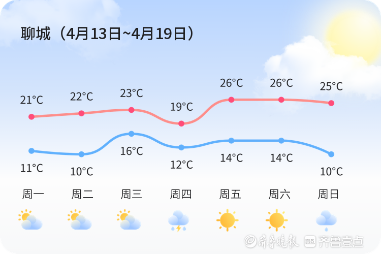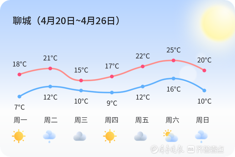 全市周平均最高温23℃,平均最低温12℃,平均气温17℃,周最高气温26℃,出现在周五、周六,周最低温10℃,出现在周二、周日。