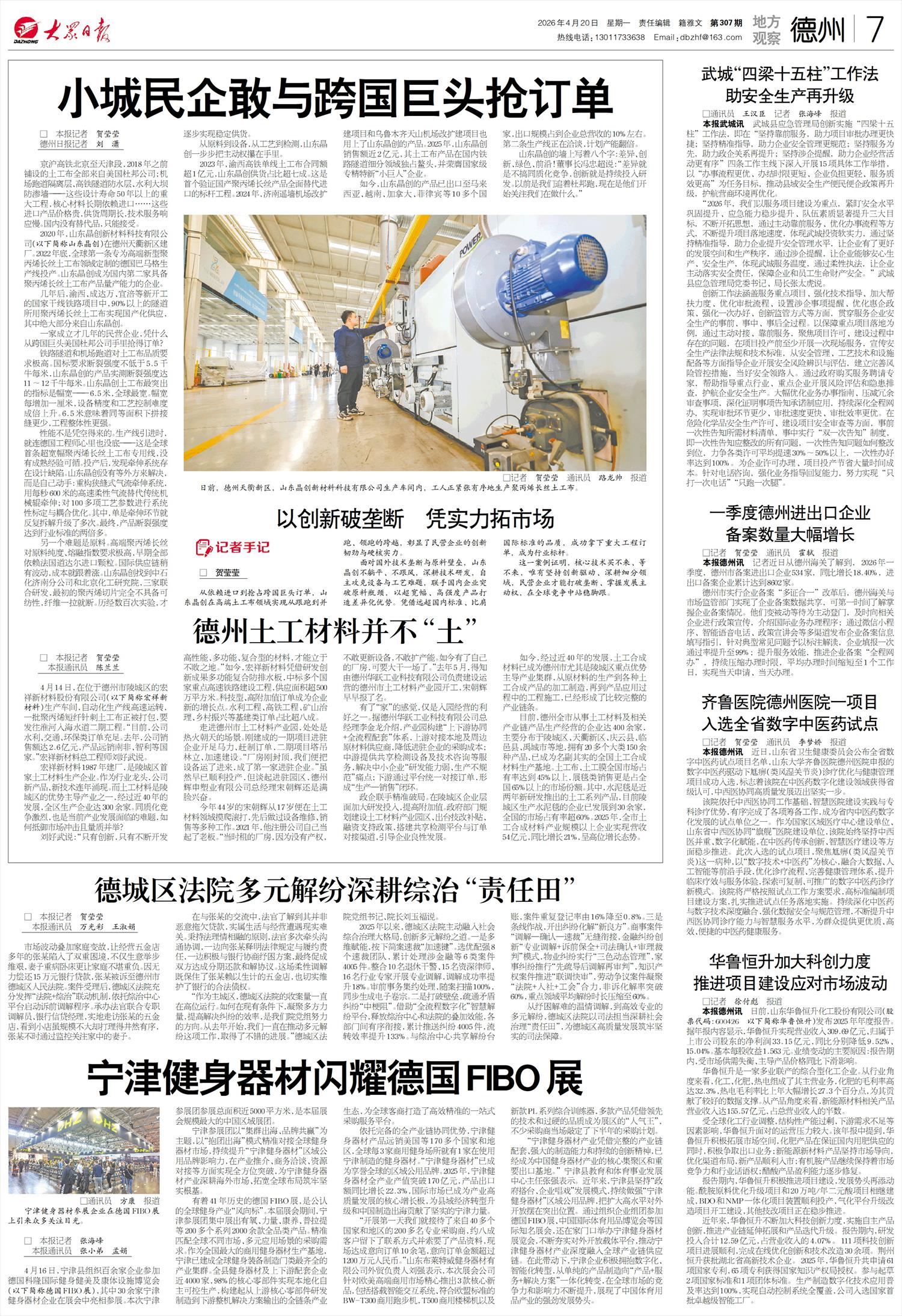 2023年,渝西高铁单线土工布合同额超1亿元,山东晶创供货占比超七成。这是首个验证国产聚丙烯长丝产品全面替代进口的标杆工程。2024年,济南遥墙机场改扩建项目和乌鲁木齐天山机场改扩建项目也用上了山东晶创的产品。2025年,山东晶创销售额近2亿元,其土工布产品在国内铁路隧道细分领域的国内市场独占鳌头,并荣膺国家级专精特新“小巨人”企业。