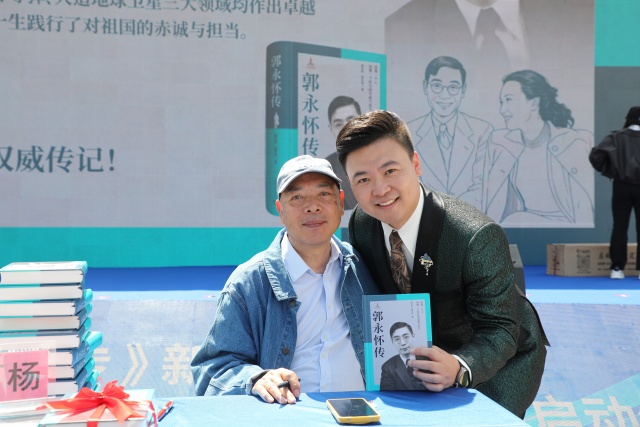 4月19日上午,栖霞街“永怀不忘”主题展台前满是读者。《郭永怀传》作者郁百杨一边签售,一边分享起郭永怀的故事。