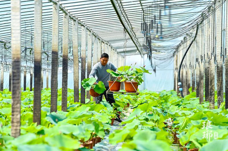 4月17日,在河东区八湖镇,村民正忙着为客户挑选大棚荷花盆景。连日来,村民们抢抓农时整池、栽藕,莲藕大棚内的荷花盆景更是订单不断。2023年,由村党支部牵头成立莲藕种植合作社,推动莲藕产业迈向规模化、产业化发展。合作社深耕莲藕种植,构建起种植、销售、农旅融合的完整产业链,切实带动村集体增收、村民致富。