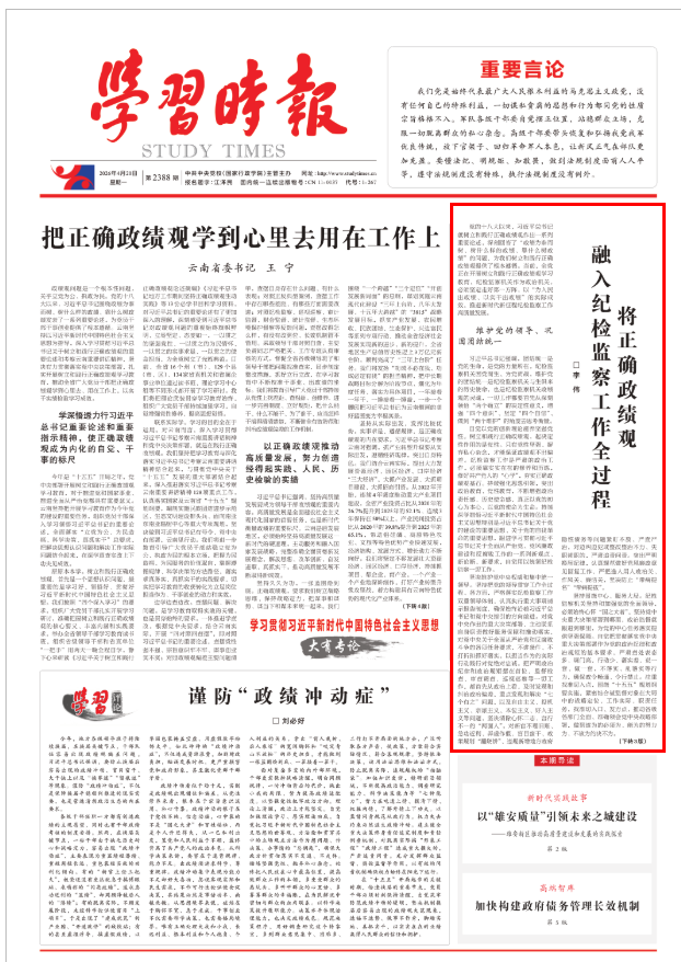 《学习时报》头版刊发李伟署名文章《将正确政绩观融入纪检监察工作全过程》