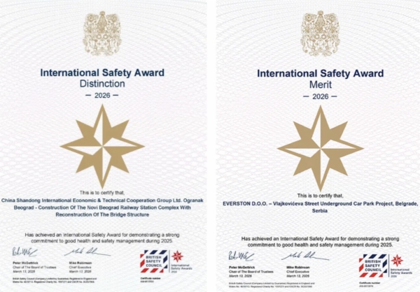 近日,2026年度国际安全奖(International Safety Award)评选结果公布,山东高速所属国际合作公司承建的新贝尔格莱德火车站综合体建设和桥梁结构重建项目(以下简称“新贝火车站项目”)斩获最高奖项卓越奖(Distinction),塞尔维亚贝尔格莱德地下停车场项目(以下简称“停车场项目”)荣获优异奖(Merit)。这一成果标志着山东高速海外项目的安全管理水平获得国际权威机构的高度认可。