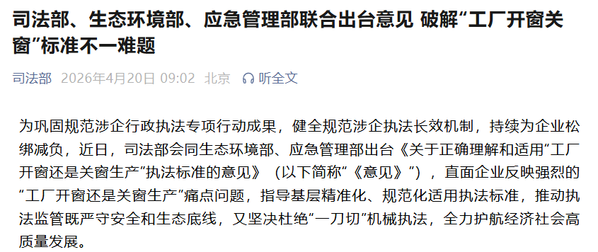 为巩固规范涉企行政执法专项行动成果,健全规范涉企执法长效机制,持续为企业松绑减负,近日,司法部会同生态环境部、应急管理部出台《关于正确理解和适用“工厂开窗还是关窗生产”执法标准的意见》(以下简称“《意见》”),直面企业反映强烈的“工厂开窗还是关窗生产”痛点问题,指导基层精准化、规范化适用执法标准,推动执法监管既严守安全和生态底线,又坚决杜绝“一刀切”机械执法,全力护航经济社会高质量发展。
