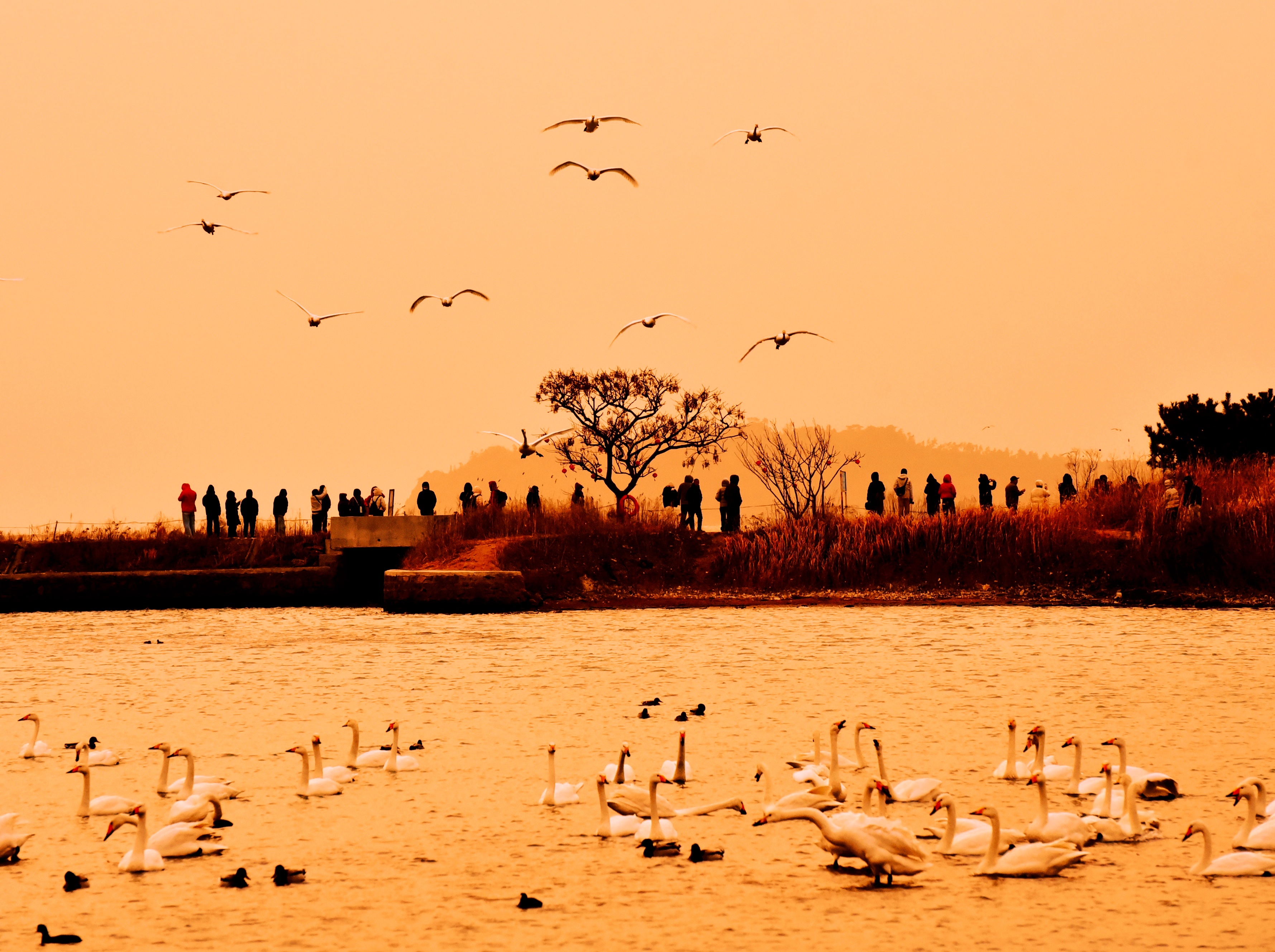 作品说明:天气回暖,在荣成天鹅湖越冬的天鹅即将踏上回迁之路。作者计划拍摄日出时刻的天鹅,因天气不好,只好将焦点对准岸边摄影人,使用小光圈和三角架支撑拍摄,前景和天空中的天鹅与岸边的摄影人,构成了一幅完美的人与自然和谐共生的画面。