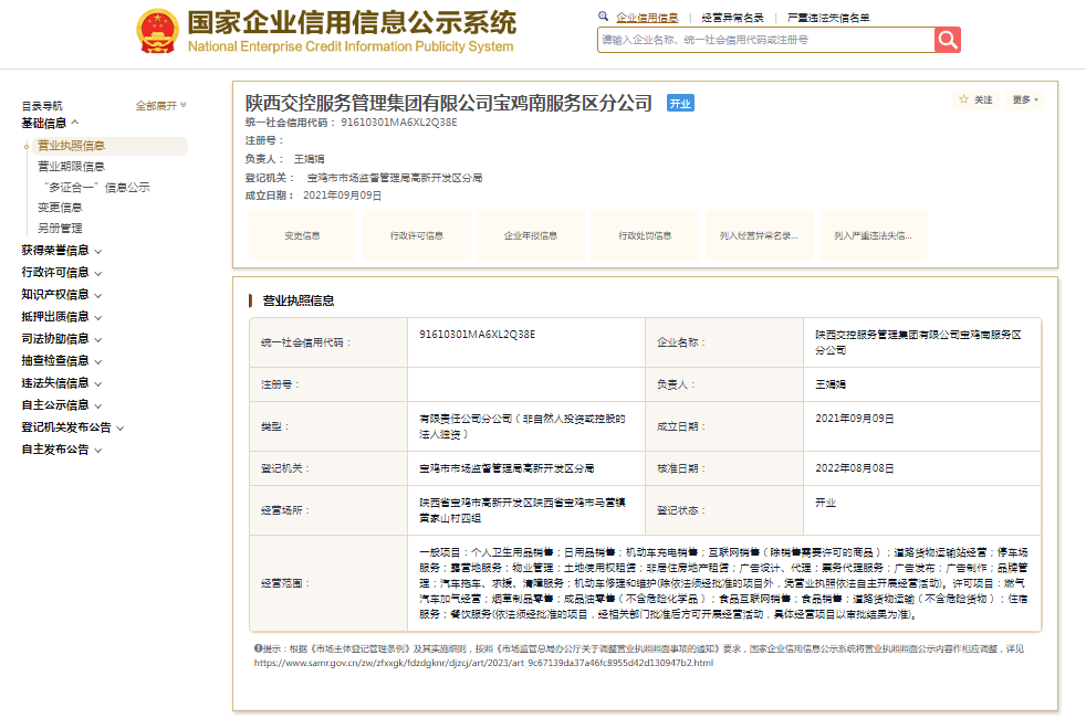国家企业信用信息公示系统显示,陕西交控服务管理集团有限公司宝鸡南服务区分公司成立于2021年,负责人王娟娟。其母公司——陕西交控服务管理集团有限公司成立于2021年,注册资本60000万元人民币,法定代表人为崔琦,由陕西交通控股集团有限公司全资持股。