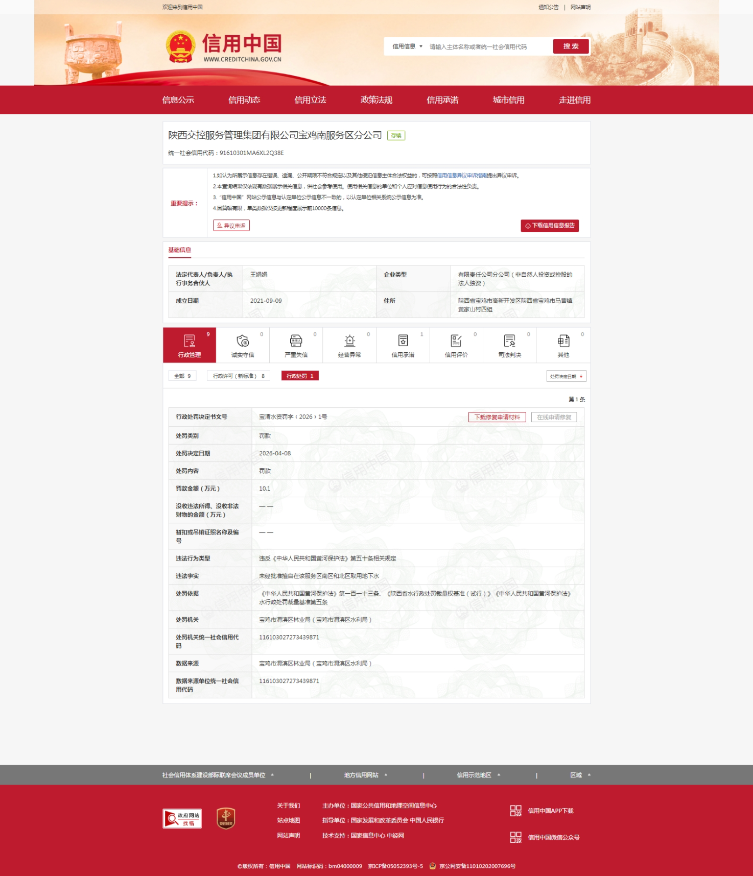齐鲁晚报·齐鲁壹点记者于信用中国行政处罚栏获悉,4月8日,陕西交控集团旗下的陕西交控服务管理集团有限公司宝鸡南服务区分公司(下称“陕西交控服务管理集团宝鸡南服务区分公司”)因违反《中华人民共和国黄河保护法》第五十条相关规定被行政处罚,处罚机关为宝鸡市渭滨区林业局(宝鸡市渭滨区水利局)。