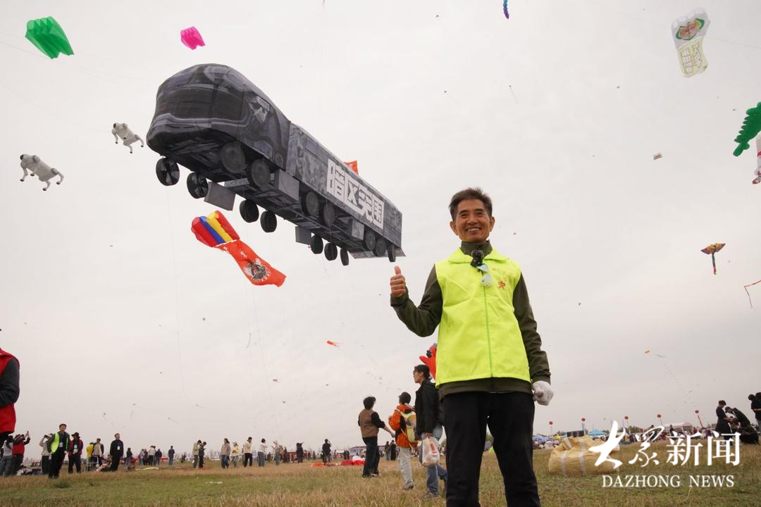 非遗代表性传承人郭洪利与他为腾讯游戏《暗区突围》制作的“大运”风筝合影。