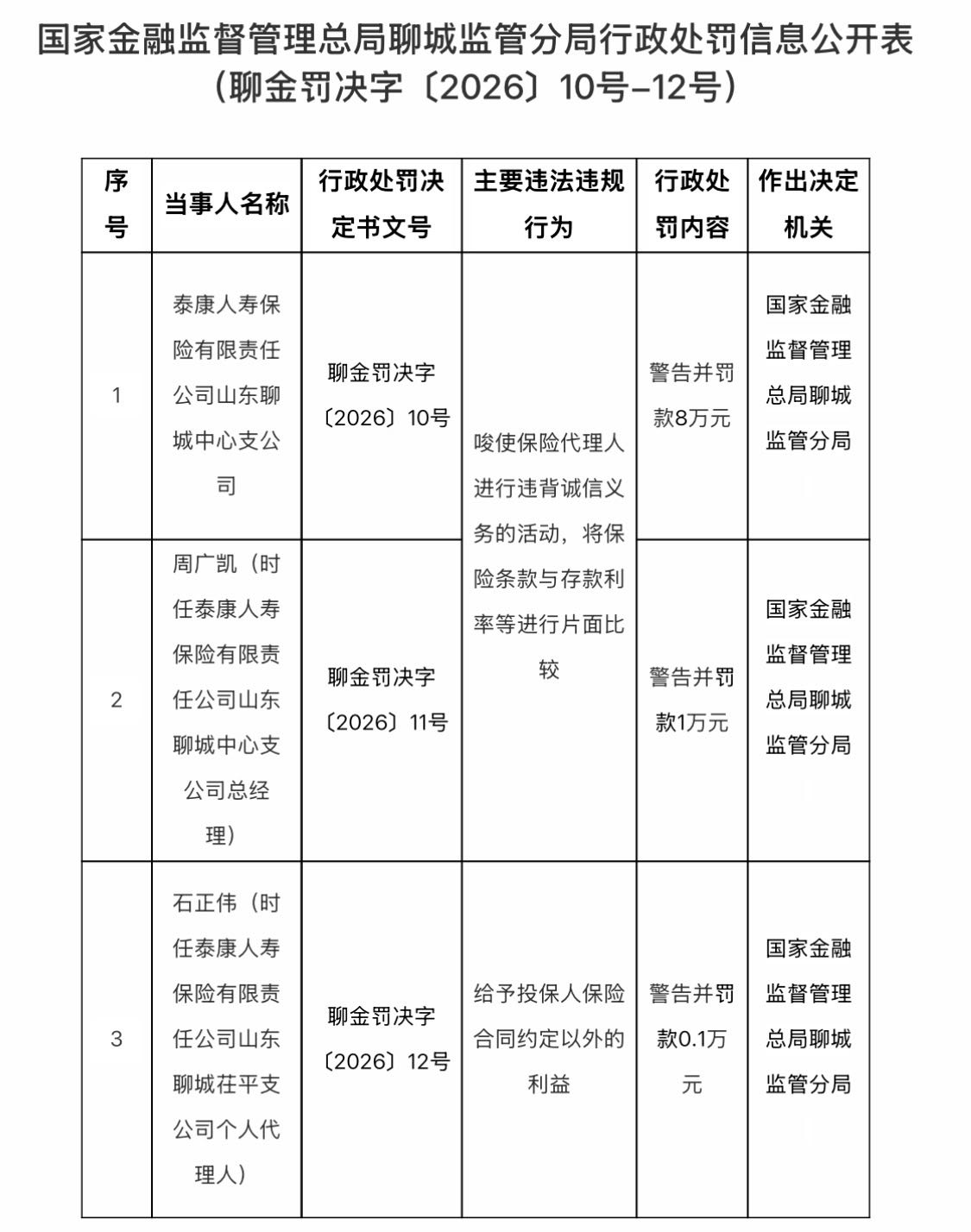 近日,国家金融监督管理总局聊城监管分局公布行政处罚信息公开表(聊金罚决字〔2026〕10号-12号)。